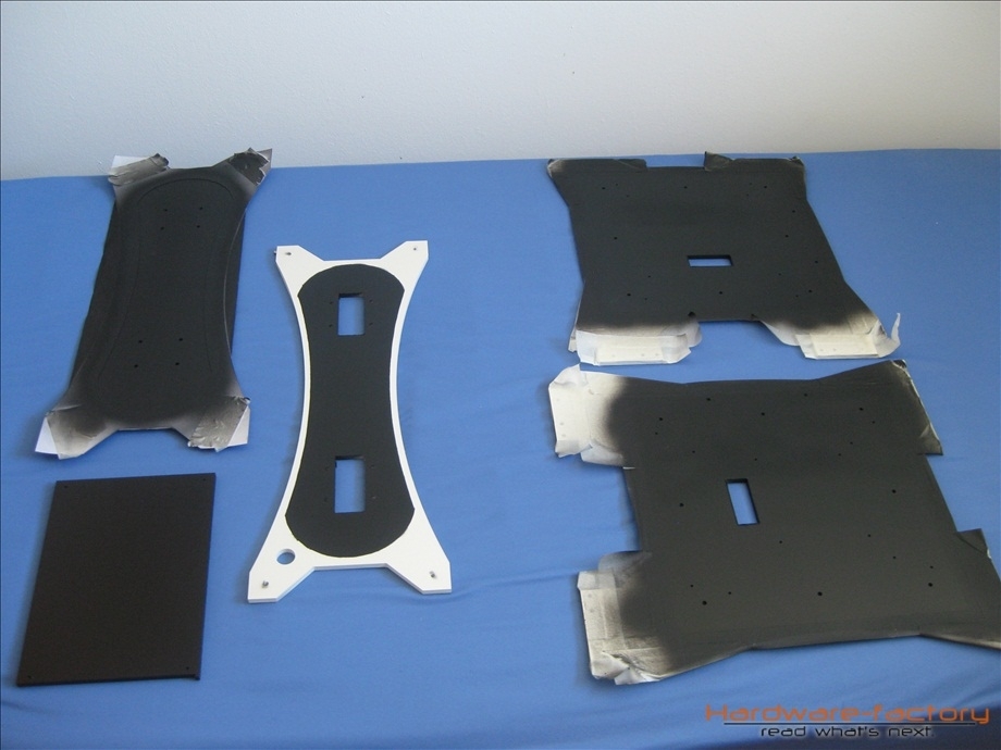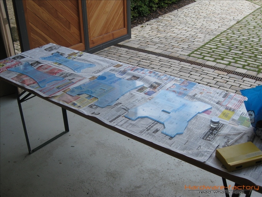 Ein paar der Plexiglasplatten werden mit einer Farbschicht versehen. Die Schicht auf der sich die Farbe befindet, wird später der Innenseite zugewandt sein, so sieht man die Farbe nur durch das Plexiglas, was einen Tiefeneffekt ergibt und einen Glanzeffekt erzeugt.