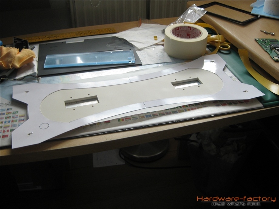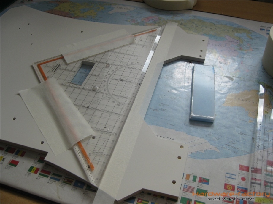 Während die Farbe trocknete, wurden Schablonen für die zweite Farbe angefertigt. Warum eine zweite Farbe? Die weiße Farbe ist trotz einer dicken Schicht noch sehr Lichtdurchlässig. Später wird dahinter aber eine LED-Leiste sitzen, welche nur an die Front strahlen solll, jedoch nicht zu den Seiten. Aus diesem Grund wird noch eine schwarze Farbeschicht auf die weiße Schicht lackiert, damit die LED Leiste verdeckt wird.