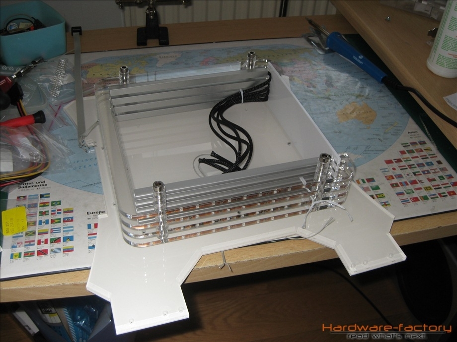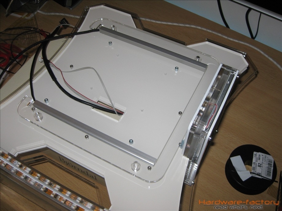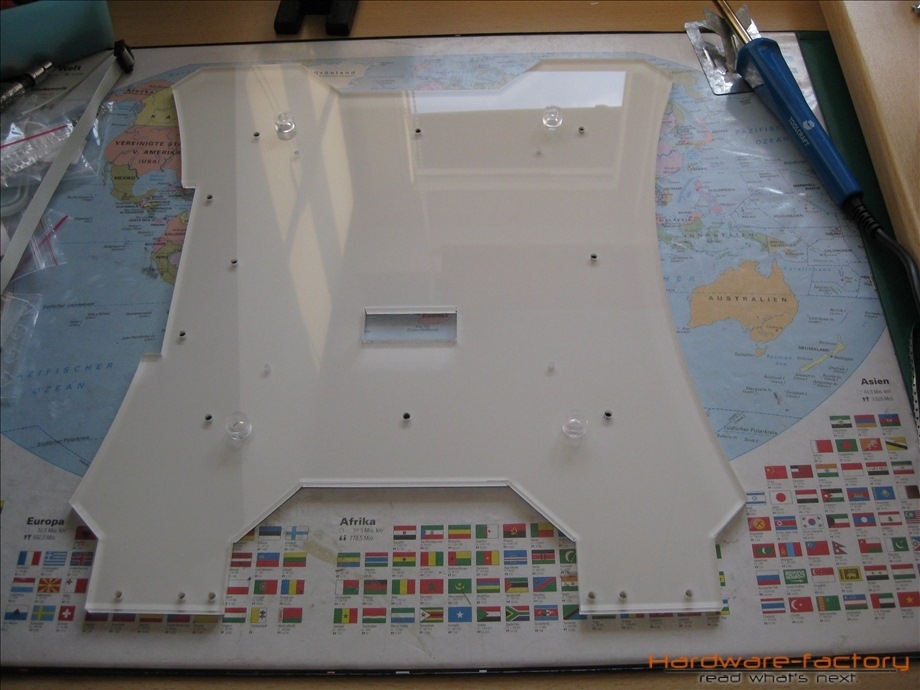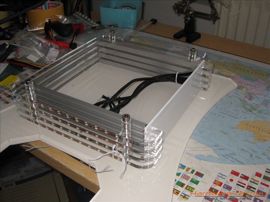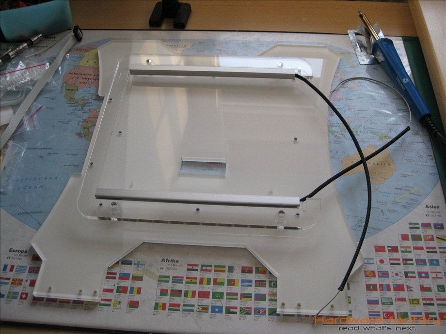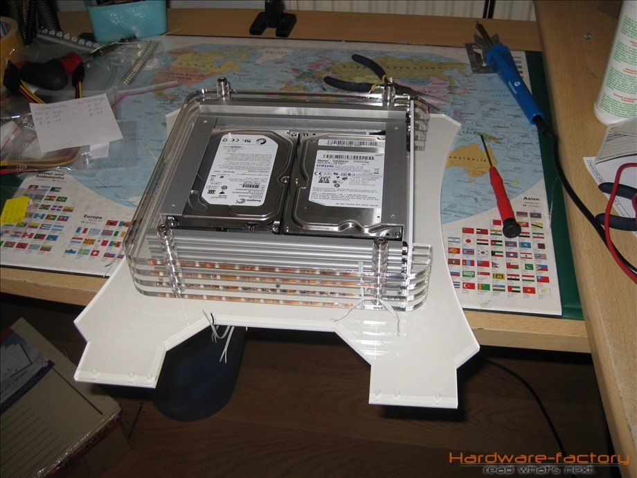 Kommen wir nun zum Mainboard- und HDD-Käfig. Bestehend aus einzelnen Plexiglasplatten und Abstandshaltern werden diese später im Sandwich-Verfahren aufgebaut. Zuerst müssen alle einzelnen Plexiglasplatten mit den zuvor angefertigten Led-Leisten ausgestattet werden.