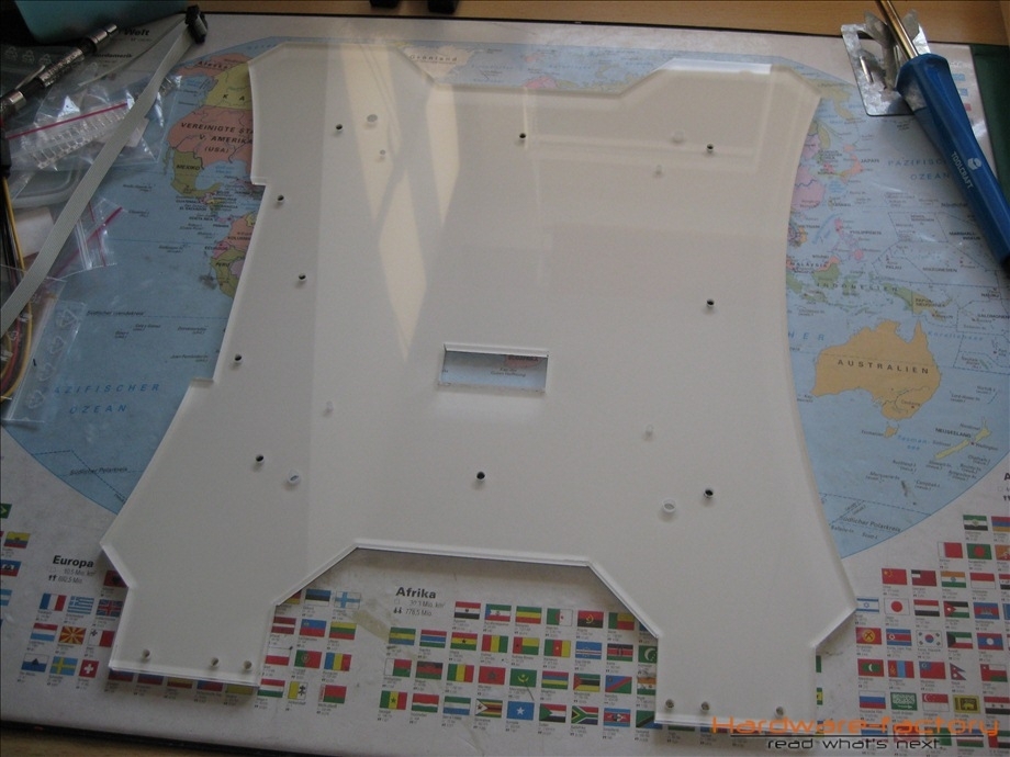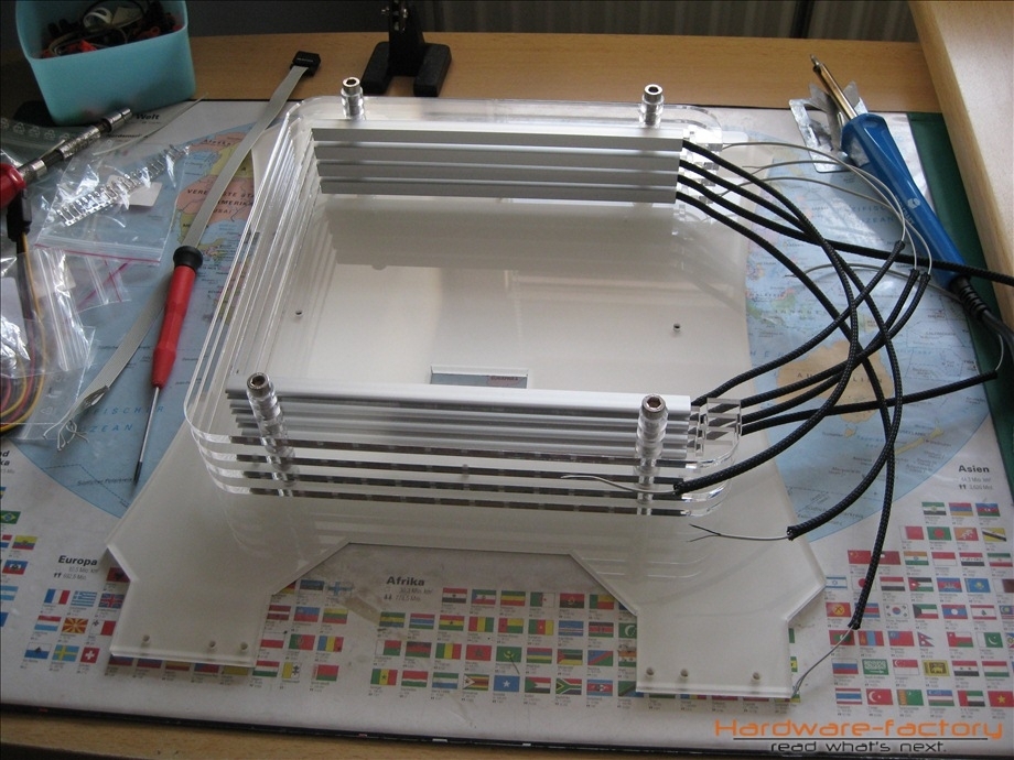 Schließlich werden alle Plexiglasplatten am Gehäuse montiert. Zuerst die Abstandshalter, dann eine Plexiglasplatte und erneut Abstandshalter – eben wie ein Sandwich.