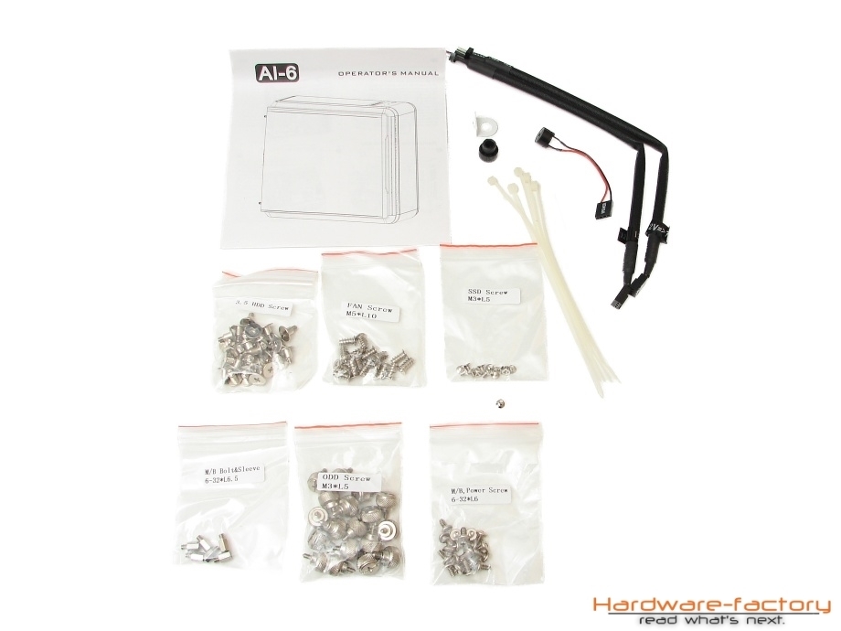 Das umfangreiche und gut sortierte Montagezubehör wird mittels einer kleinen weißen Schachtel dem Gehäuse beigelegt. Zum Lieferumfang zählen neben diversen Schrauben für die Montage von ODDs, SSDs, HDDs, Gehäuseventilatoren und des Mainboards auch entsprechende Abstandhalter für letztgenannte Komponente, jeweils säuberlich sortiert sowie etikettiert in sechs getrennten wiederverschließbaren Beuteln, sechs Kabelbinder sowie ein Piezo-Lautsprecher. Für die beiden zur Grundausstattung zählenden und bereits vormontierten Gehäuselüfter wurden seitensanidées zwei 3-Pin-Molex-Spannungsadapter zur Drosselung des Betriebsspannung auf 5 Volt sowie 7 Volt beigelegt.