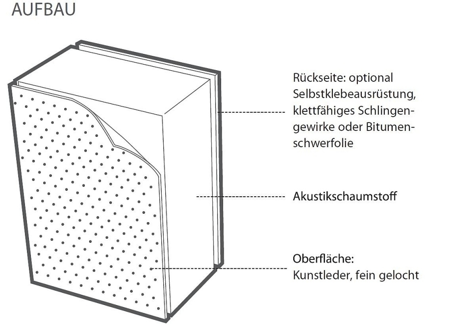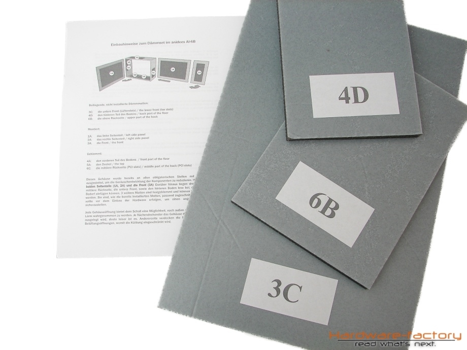 Die uns zur Verfügung stehende Variante wurde im Rahmen des King Mod Service von Caseking bereits mit passgenau zugeschnitten schallabsorbierenden Dämmmatten ausgestattet. Eine Minderung der Geräuschkulisse der innenliegenden Komponenten erreichen die Dämmmatten durch das absorbieren per Luft übertragener Schwingungen sowie das gleichzeitige Reduzieren durch das Gehäuse weitergeleiteter Schwingungen. Dies ist primär auf den verwendeten Akustikschaumstoff der Dämmmatten - wie im unteren Bild schematisch dargestellt - zurückzuführen, die darüber hinaus eine fein gelochte Oberfläche aus Kunstleder besitzen. Insgesamt liegen dem Gehäuse neun zugeschnitte Dämmmatten bei, wobei ein Teil der Dämmmatten bereits vormontiert wurde. Typischerweise handelt es sich dabei um Bereiche, die nicht durch zusätzliche Gehäuselüfter erweitert werden können. Im Falle des AI-6 sind dies die beiden Seitenteile sowie die Frontklappe des Gehäuses. Drei weitere Dämmmatten wurden im Falle des Deckels, des Bodens und des Hecks bereits eingeklemmt, jedoch nicht verlegt. Optional und je nach Lüfterbestückung liegen dem Gehäuse noch drei zusätzliche Dämmmatten bei, falls kein Gehäuselüfter in der Front oder im Heck eingesetzt oder ein passives Netzteil verwendet wird, welches über keine Lüfteröffnung verfügt. Dem Dämmset liegt zusätzlich eine DIN-A4 große deutschsprachige Anleitung mit Einbau- und Pflegehinweisen bei.