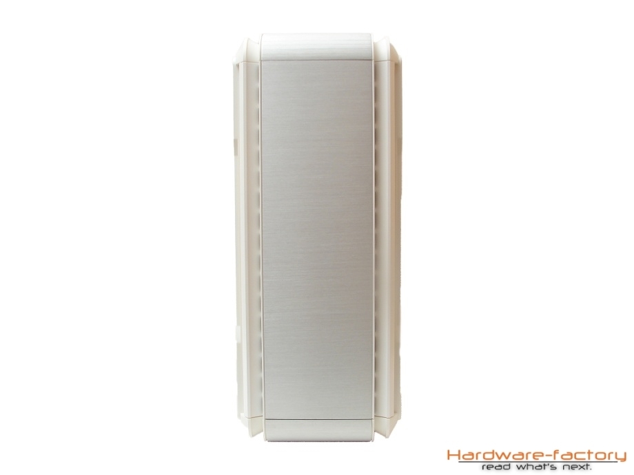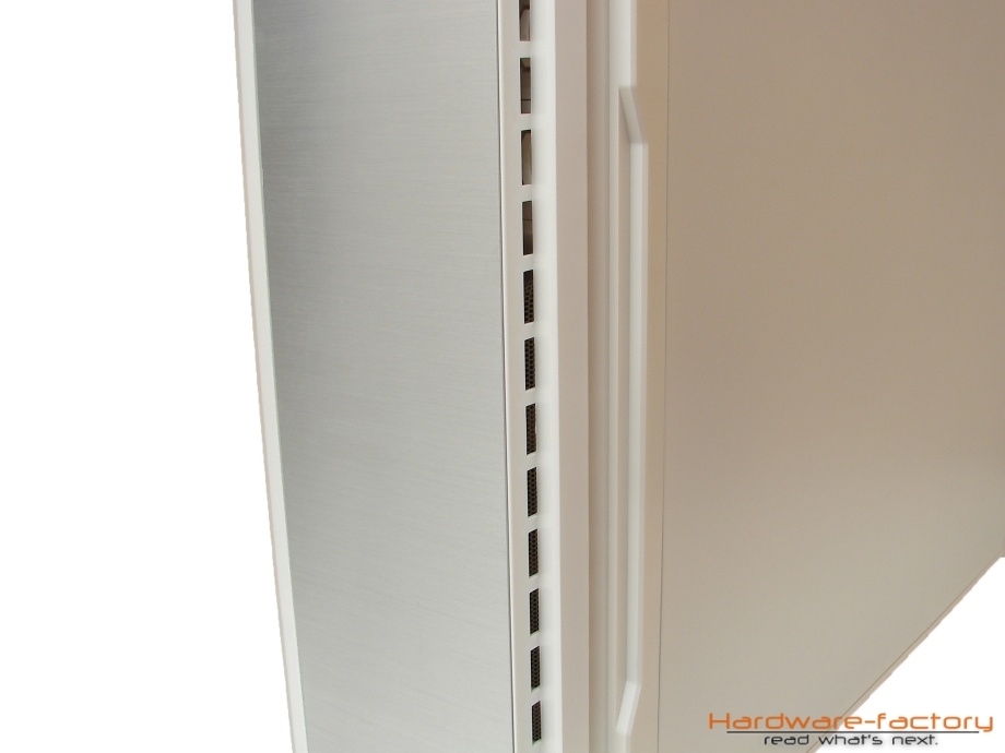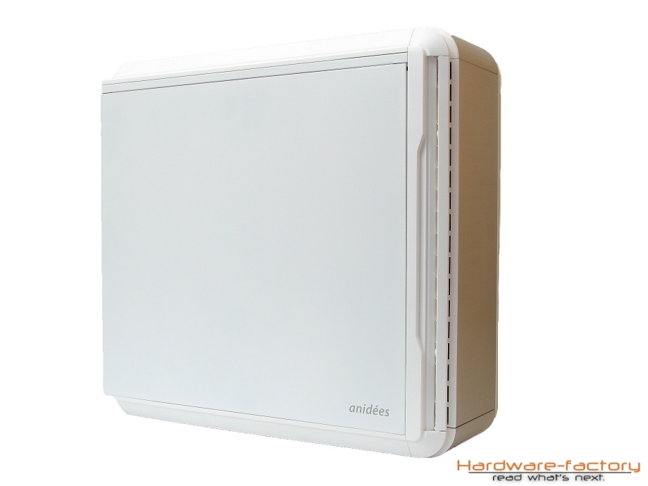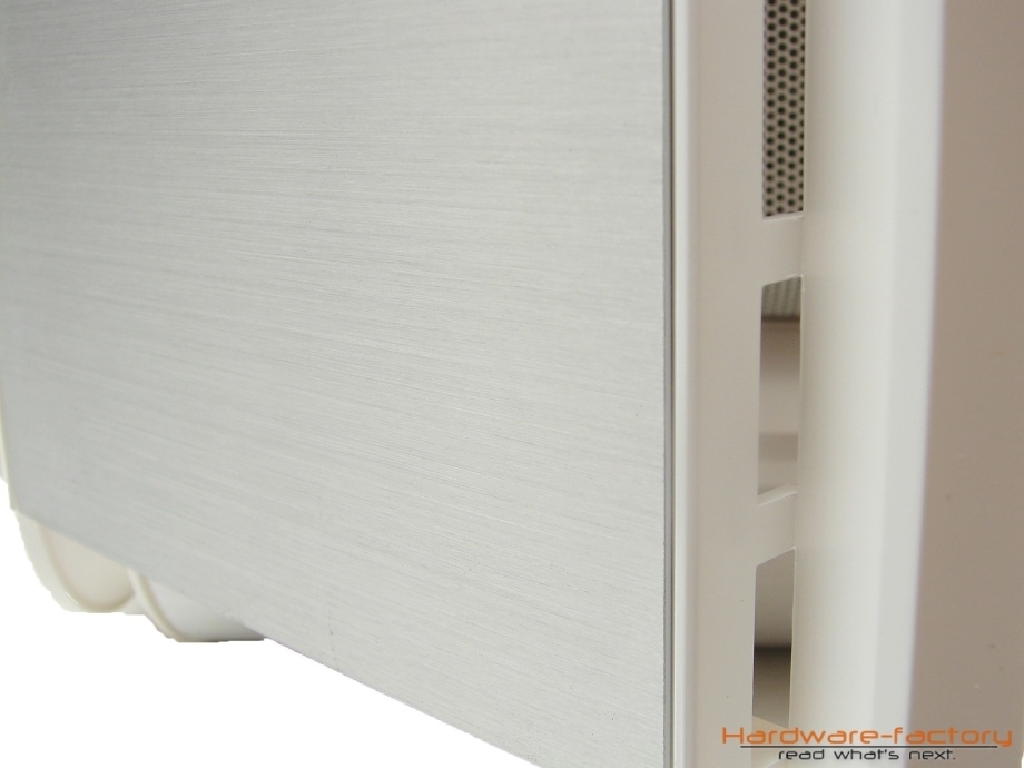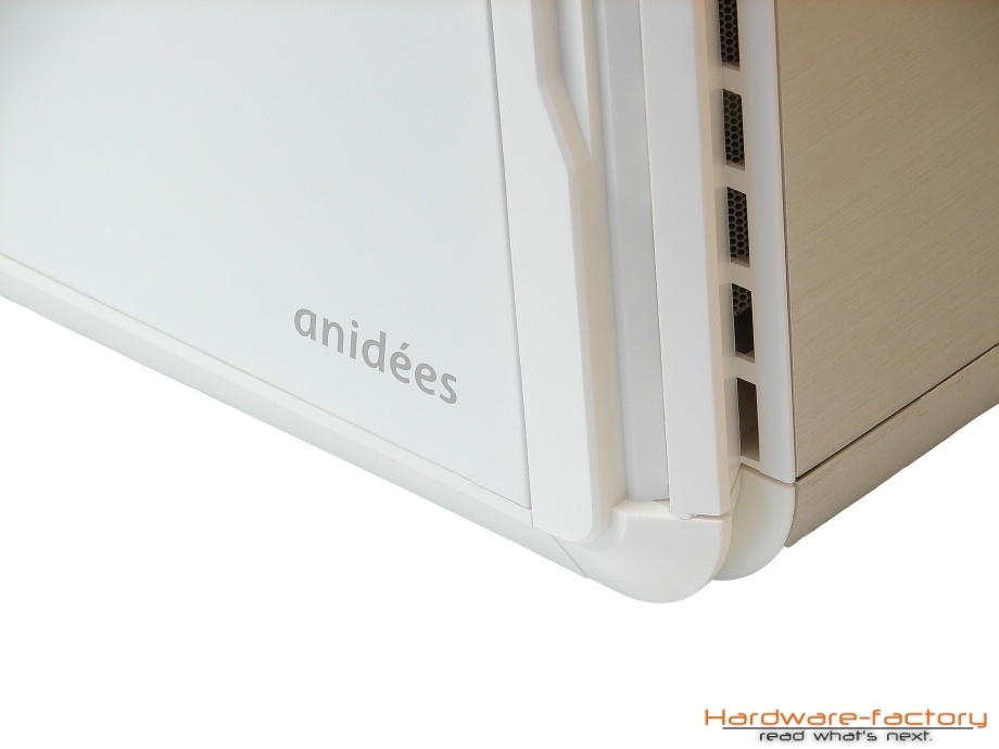 Erst auf den zweiten Blick ersichtlich und weit mehr aus nur eine designtechnische Spielerei sind die seitlich angebrachten Öffnungen, die sowohl in der Front als auch im Deckel-Bereich eingearbeitet wurden. Diese Öffnungen ermöglichen den montierten Gehäuselüftern bei dem sonst komplett geschlossenen Gehäuse eine Luftzuführ, über die wahlweise kalte Luft in das Gehäuse hinein oder erwärmte Luft aus dem Gehäuse hinaus transportiert werden kann. Das von anidées beabsichtigte Erscheinungsbild eines geschlossenen Systems bleibt dadurch elegant erhalten, ohne jedoch eine schlechte Kühlleistung des Gehäuses zu riskieren. Durch abgerundete Aluminiumelemente im oberen und unteren Bereich der Frontpartie wird nicht nur die Fronttür optisch unauffälliger, auch das Design des AI-6 wirkt formschöner und erwachsen.