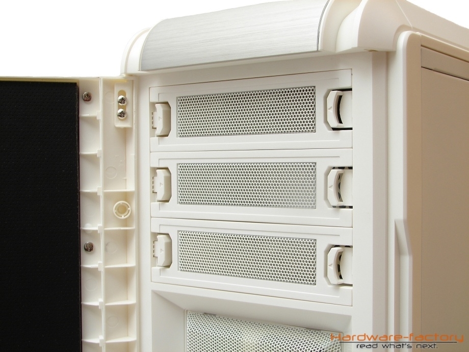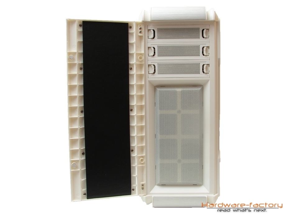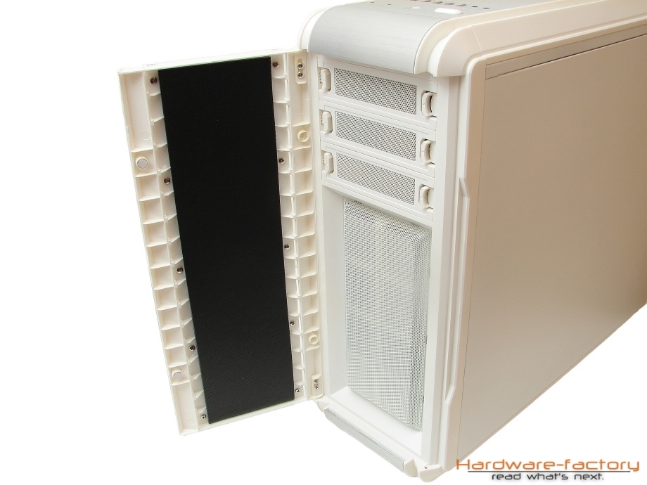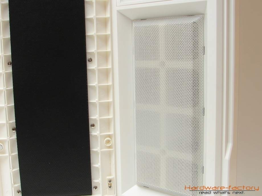 Ein Öffnen der Fronttür bringt gleich mehrere interessante Elemente zum Vorschein. Die Rückseite der Tür wurde im Rahmen des King Mod Service von Caseking bereits mit einer fest verklebten Dämmmatte versehen. In erster Linie tritt jedoch das verwendete Meshgitter zum Vorschein, welches nun das Erscheinungsbild dominiert. Rund zwei Drittel der zum Vorschein kommenden Fläche wird dabei durch ein einziges Meshgitterelement bedeckt, hinter dem wahlweise bis zu zwei 140mm große Gehäuselüfter agieren können und durch das verwendete Meshgitter eine optimale Arbeitsumgebung vorfinden. Das oben liegende Drittel ermöglicht eine Montage von bis zu drei externen Komponenten in den 5,25 Zoll großen Laufwerksschächten. Die Blenden werden passend zum restlichen Design ebenfalls zum größten Teil aus Meshgitter gefertigt und lassen sich kinderleicht durch Zusammendrückender außenliegenden Klammern entfernen. Nicht unerwähnt sollen an dieser Stelle die zur Anwendung kommenden schaumstoffähnlichen Staubfilter sein, die hinter jeder der Blenden sowie dem großen Meshelement eingearbeitet wurden. Diese sind nicht Bestandteil der zusätzlichen Erweiterung durch den King Mod Service, sondern gehören zur Grundausstattung.