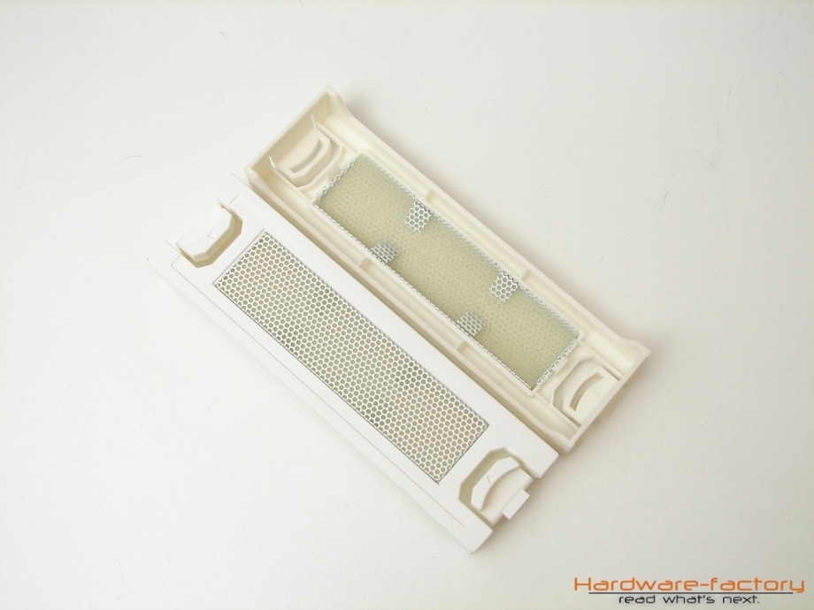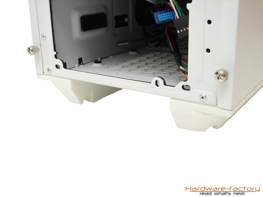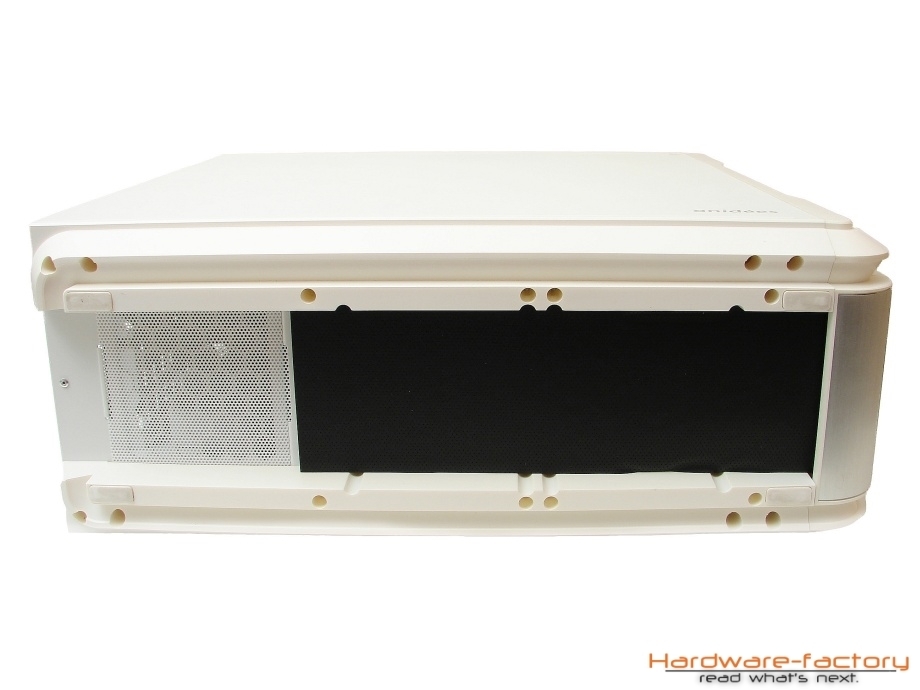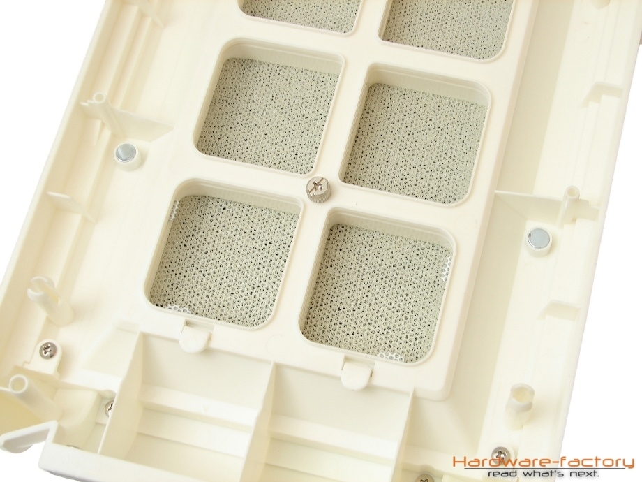 Für die Unterseite hat anidées sich beim AI-6 etwas besonderes Einfallen lassen. Statt des Einsatzes herkömmlicher Standfüße hat sich die Firma bei diesem Gehäuse für ein rund 35 mm hohes Kunststoffpodest entschieden, welches wiederum über kleinere Gummiauflagen verfügt. Dadurch wird der Bodenbereich ebenfalls komplett verschlossen und die Störgeräusche können nur durch die hintere Öffnung direkt an die Umgebung entweichen. Auch ein Ansaugen von Staub aus allen Richtungen durch das Netzteil oder die optimal am Boden anbringbaren Gehäuselüfter wird so auf ein Minimum reduziert. Die eigentliche Bodenplatte wurde in einem groben Wabenmuster ausgestanzt und bietet genügend offenen Fläche, damit das Netzteil sowie die Gehäuselüfter mit Luft zu versorgt werden können. Wichtig für die Langlebigkeit des Netzteils und der weiteren Komponenten wurde der Bodenbereich von außen mit einem einfachen, groben Staubfilter - gefertigt aus einem feinen Meshgitter - versehen. Werden vom Anwender keine Gehäuselüfter im Bodenbereich platziert, bietet Caseking eine vorgefertigte Dämmmatte für diesen Bereich an, um die Lautheit des Systems nochmals zu reduzieren.