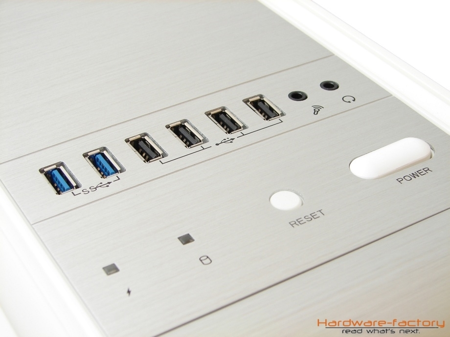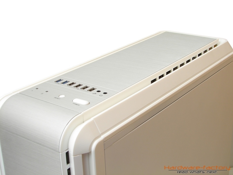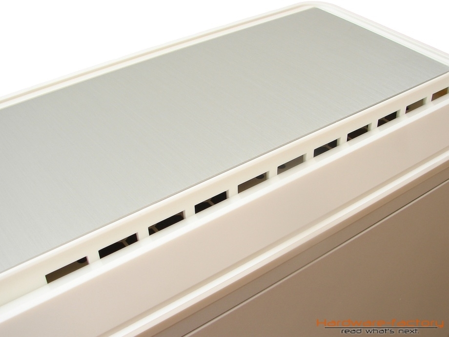 Der Deckelbereich führt das Design nahtlos fort und bildet so mit der Frontpartie optisch eine Einheit, die eine homogene Geschlossenheit signalisiert. Auch hier lassen sich die gleichen Elemente wie zuvor bei der Fronttür identifizieren: Ein großflächiger Einsatz von gebürstetem Aluminium und die Verwendung von Belüftungsschlitzen. Im vorderen Deckelbereich des Gehäuses wurde von anidées das Front-Panel eingearbeitet. Das zweireihige Panel setzt sich in der ersten Reihe aus dem Power- und Reset-Taster sowie zwei LEDs für den Betrieb und Festplattenzugriff zusammen. Direkt dahinter befinden sich umfangreiche Anschlussmöglichkeiten in Form von vier USB2.0- und zwei USB3.0-Schnittstellen sowie jeweils eine 3,5 mm Klinkenbuchse für den Sound-Ausgang und -Eingang. Leider unterläuft anidées beim Frontpanel der ein oder andere Patzer. Dass einige der USB2.0-Ports schief eingepasst wurden, hat nur optische Auswirken und schränkt die Verwendung in keiner Weise ein; störender ist an dieser Stelle der schiefe Power-Taster. Hier sind mitunter einige Versuche nötig, um ein Auslösen zu erzwingen, was bei einem Gehäuse in dieser Preisklasse inakzeptabel ist. Die in U-Form rückseitig entlanglaufenden Luftschlitze sind weitaus mehr als nur ein einfaches Designelement. Unter dem Deckel bietet das Gehäuse Platz für zwei Gehäuselüfter im 120-mm- respektive 140-mm-Format, die für einen Abtransport der aufsteigenden erwärmten Luft sorgen können.