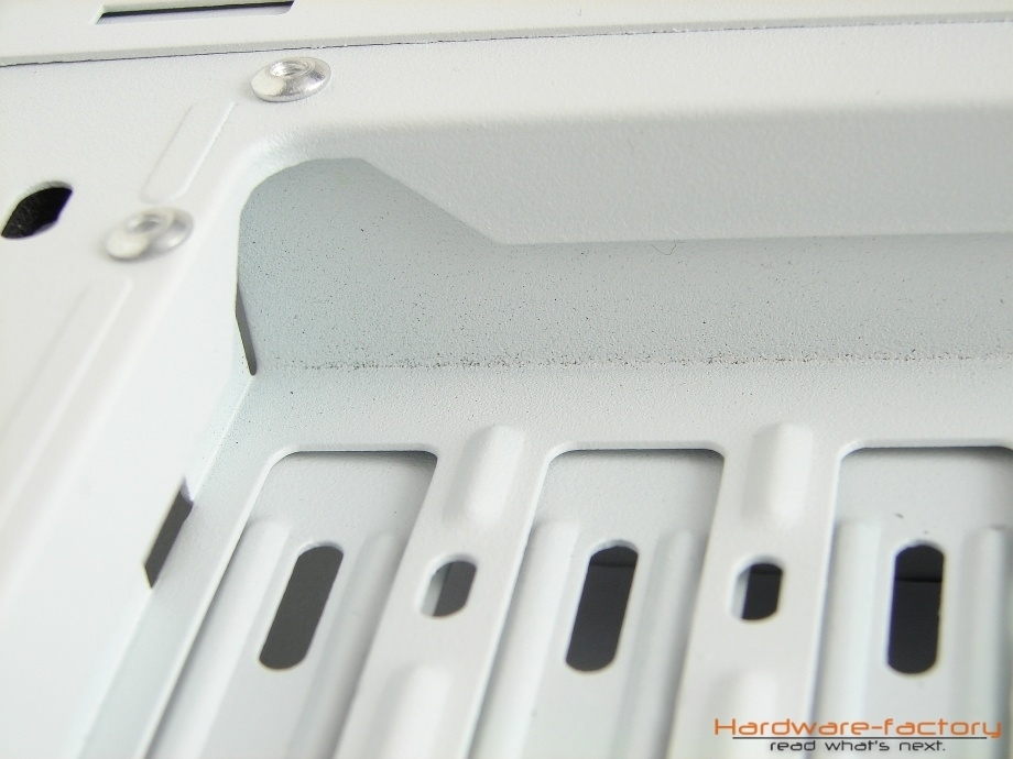 Zusammenfassend kann festgehalten werden, dass anidées beim Debüt mit dem AI-6 ein Gehäuse entwickelt hat, was durchaus Zuspruch findet. Das Design ist gut durchdacht und erfrischend Neutral, das Gesamtsystem wirkt in sich stimmig und abgeschlossen. Das verwendete Material ist ausreichend stark, die Verarbeitung der Materialien stellenweise im positiven Sinne ungewöhnlich gut ausgeprägt und robust. Auch die Spaltmaße zeichnen sich primär durch ihre Gleichmäßigkeit aus. Weniger Anklang findet allerdings das eingesetzte Plastik, vorzugsweise im Front- und Deckelbereich. Dieses hätte durchaus hochwertiger Ausfallen können, zusätzlich existieren je nach Lichtintensität und -einfall leichte Unterschiede im Farbton zwischen den Plastikelementen und der Gehäuselackierung, was den Gesamteindruck ein wenig trübt. Auch die Lackierung als solche ist nicht vollends perfekt. An einigen verwinkelten Bereichen weist das Gehäuse eine unzureichende Lackierung auf, sodass die weiße Farbe nicht vollständig deckt und schwarz-graue Bereiche der Grundlackierung respektive des Grundmaterials zum Vorschein kommen. Zusätzlich ist die Farbe an einigen wenigen kleinen Stellen abgesplittert, was jedoch auch durch den Einbau der Dämmmatten seitens Caseking herrühren und deshalb dem Hersteller nicht direkt zur Last gelegt werden kann. Bedingt durch den weißen Farbton fallen Verarbeitungsfehler dieser Sorte um ein vielfaches schneller auf. Bei der schwarzen Ausführung des AI-6 wären solche Schwächen womöglich vollkommen unentdeckt geblieben.