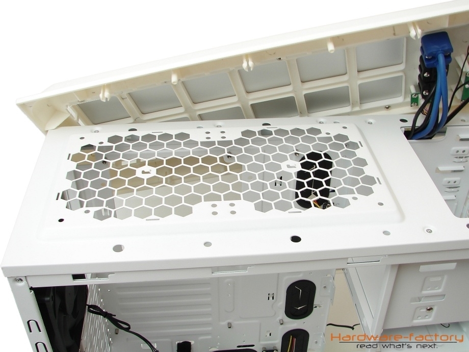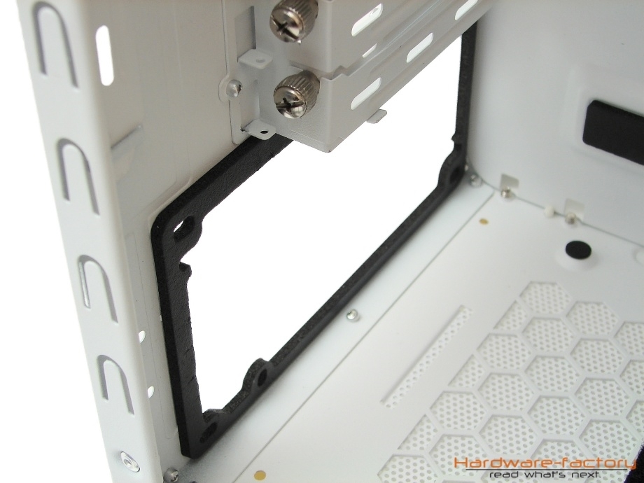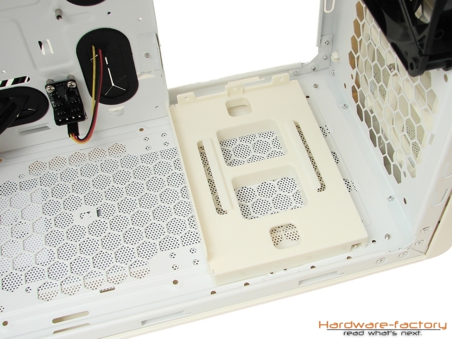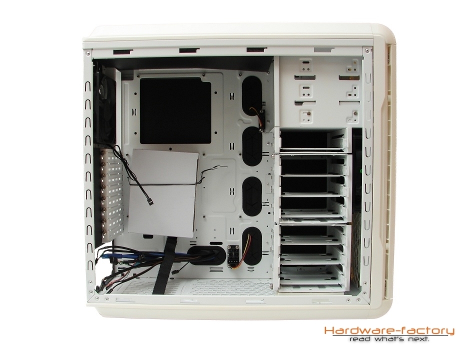 Auch wenn es bei einem vollkommen geschlossenen und ohne Sichtfernster versehenden Gehäuse überflüssig erscheinen mag, wurde auch der Innenraum durch eine weiße Lackierung farblich an das Gehäuse angepasst. Der Aufbau des Innenraumes wirkt auf dem ersten Blick sehr gut durchdacht und greift alle Merkmale auf, die einen Midi-Tower mit gehobenen Qualitätsansprüchen auszeichnen und den de facto Stand der Technik in dieser Preisklasse repräsentieren.