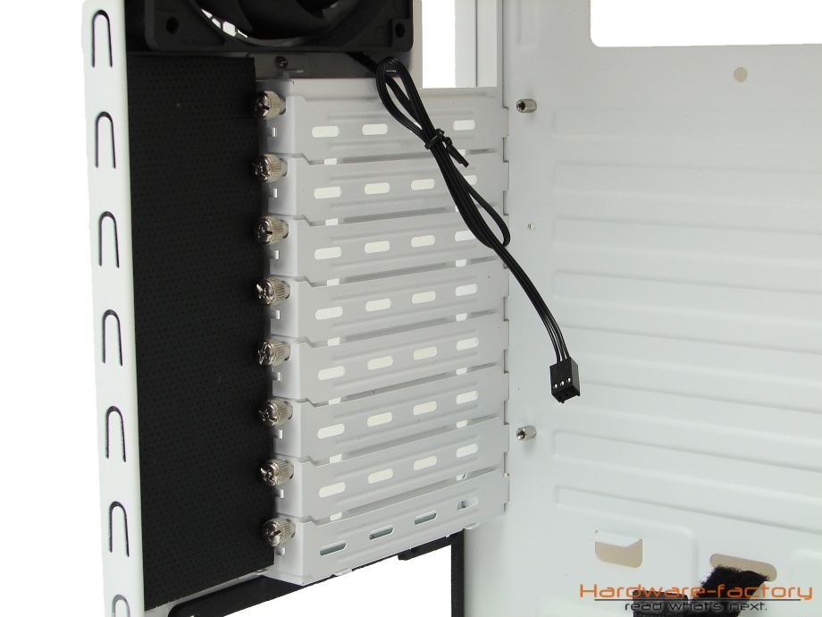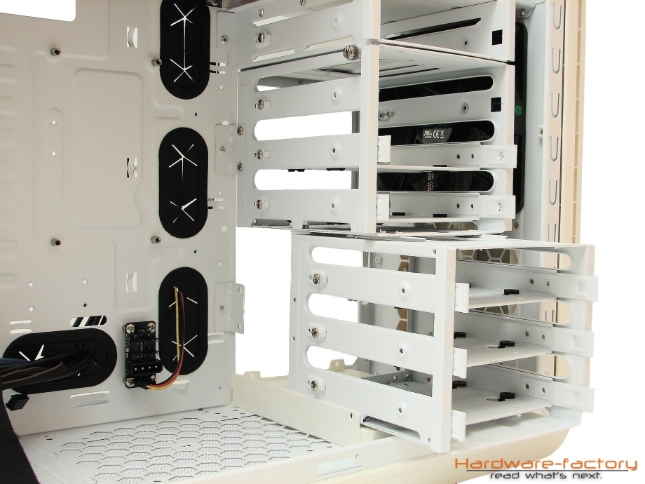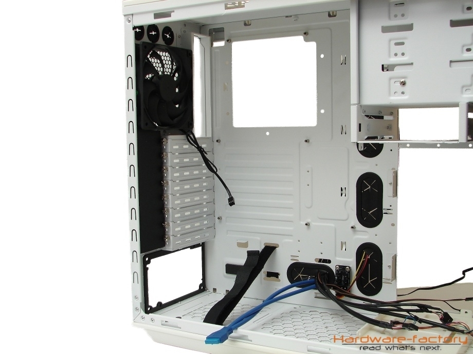 Hinter dem Festplattenkäfig befindet sich einer der zwei vormontierten Gehäuselüfter. Das 14 cm große Modell versorgt den oberen Bereich des Festplattenkäfigs mit einem entsprechenden Luftstrom, welcher den Datenträgern direkt zugutekommt. Die Front des Gehäuses weist insgesamt zwei Montageplätze für wahlweise 12 cm oder 14 cm große Modelle auf.
