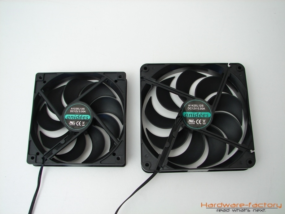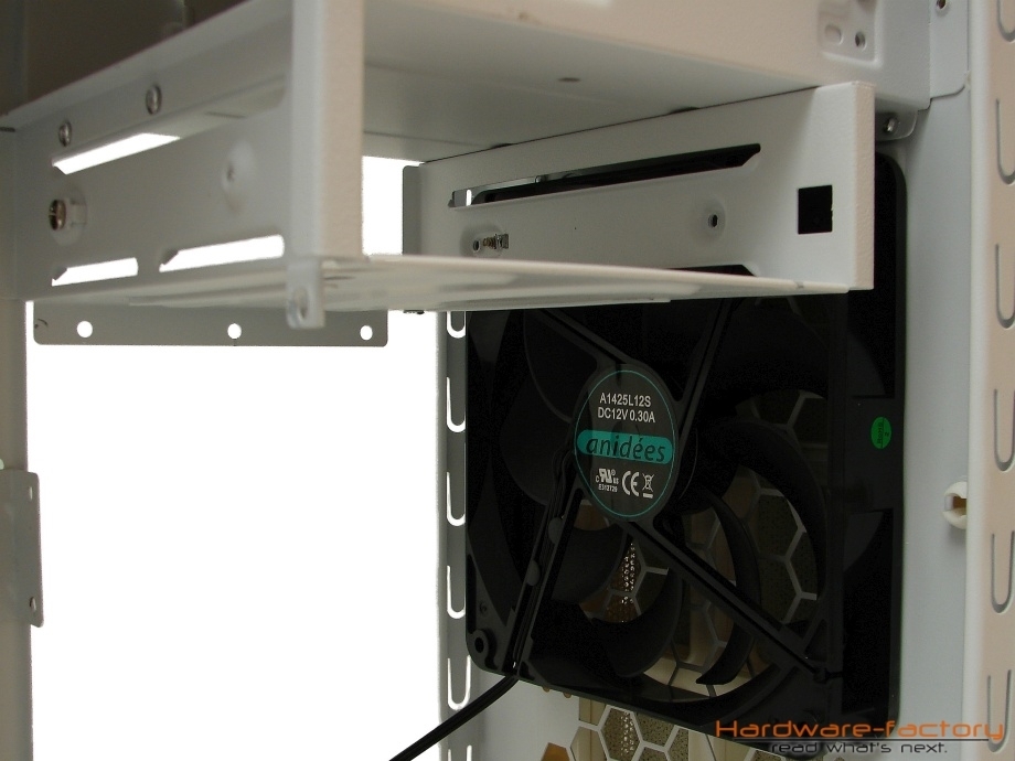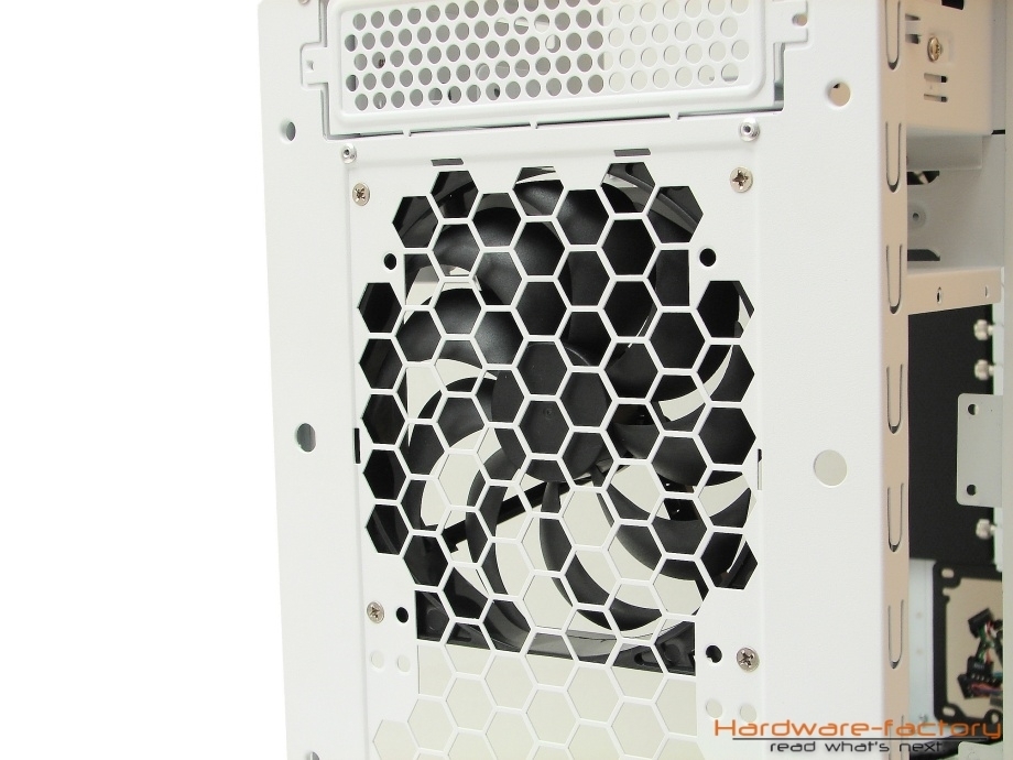 Das zweite, kleinere mitgelieferte Lüftermodell befindet sich an der Gehäuserückwand und sorgt für eine Abfuhr von erwärmter Luft aus dem Gehäuse. Die beiden Gehäuselüfter mit den Bezeichnungen A1225L12S und A1425L12S werden von der Firma Fly Alpine produziert, zu deren Kunden unter anderem Hersteller wie Aerocool und Thermaltake zählen. Weitere Montagemöglichkeiten befinden sich auf dem Boden, der bis zu zwei Lüfter bei Demontage der Führungsschiene für die Festplattenkäfige aufnehmen kann, und dem Deckel, wobei nur letzerer mit einem zusätzlichen Staubfilter versehen wurde. Da jedoch gerade der Deckelbereich als potentielle Luftzufuhr und nicht als -abfuhr genutzt wird, wäre ein Staubfilter an dieser Stelle wünschenswert gewesen.