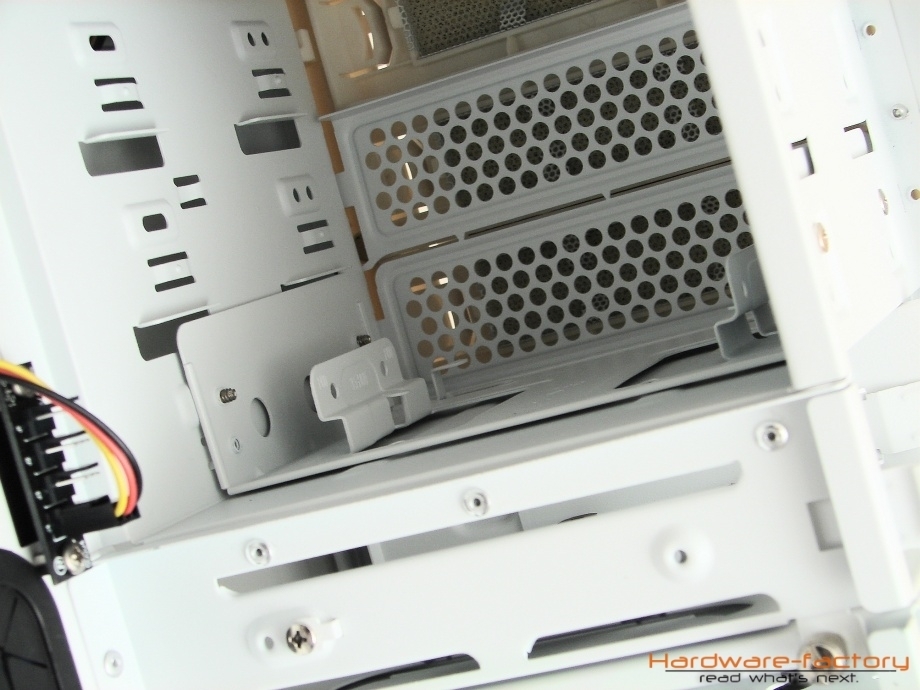 Das Gehäuse bietet dem Anwender die Möglichkeit, drei Laufwerke im 5,25"-Format zu montieren, im untersten der drei Schächte befindet sich ein Adapter, um ein 3,5"-Laufwerk oder eine entsprechende Lüftersteuerung in dem Gehäuse unterzubringen. Prinzipiell ist jeder der drei Schächte in der Lage, ein 3,5"-Laufwerk aufzunehmen. Für die Montage der externen Laufwerke bietet das AI-6 kein Schienensystem und auch keine schraubenlose Montage an. Stattdessen müssen die Laufwerke,zwar unter Zuhilfenahme von Rändelschrauben, aber dennoch auf herkömmlicher Art und Weise an dem Gehäuse befestigt werden.