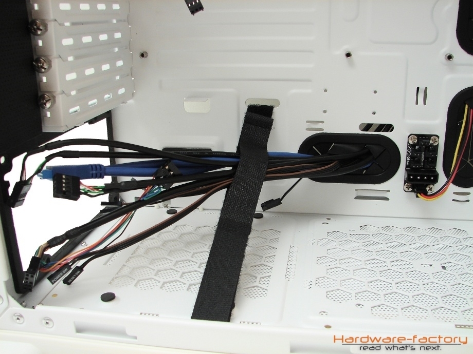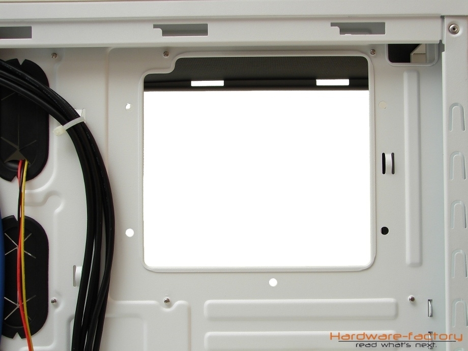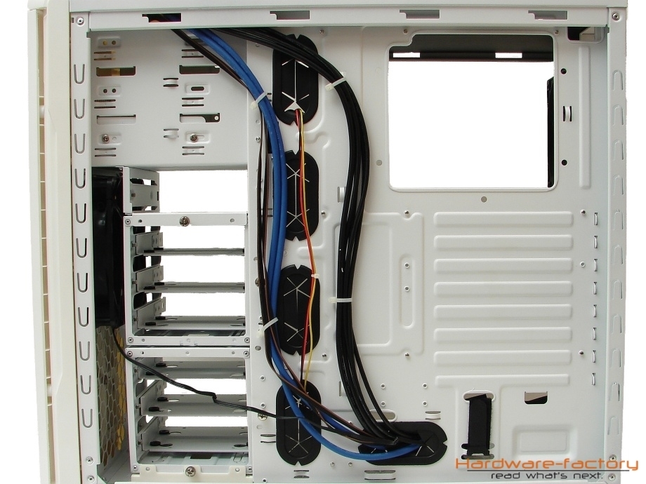 Der Aufbau des Mainboardträgers ähnelt stark erfolgreichen Konzepten von Firmen wie beispielsweise Xigmatek, GELID oder auch Corsair, was aber keinesfalls als negativ zu bewerten ist. Auffallend sind zunächst fünf großzügig dimensionierten und mit Gummitüllen versehene Öffnungen, mittels derer der Anwender über die Möglichkeit verfügt, die Kabel ordentlich verlegen zu können und diese beispielsweise hinter den Mainboardträger zu führen, wo sie den Luftstrom nicht negativ beeinflussen können und das Gehäuse aufgeräumter erscheinen lassen. Anidées unterstütz dieses Vorhaben beim AI-6 durch eine ausreichende Anzahl an Ösen, an denen die Kabel mittels Kabelbinder befestigt werden können.