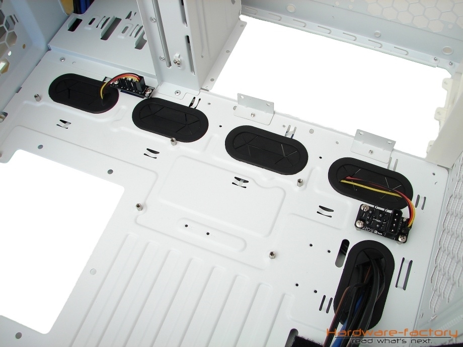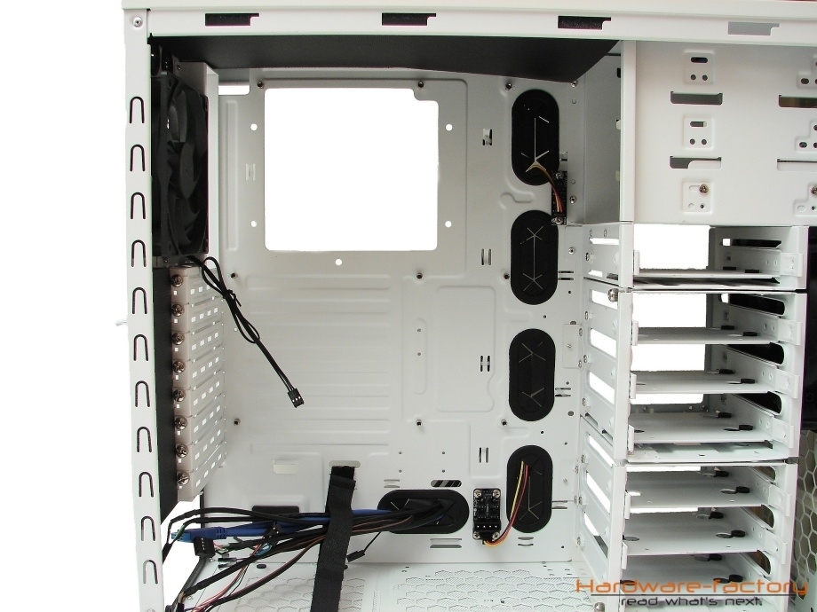 Eine zusätzliche Öffnung im oberen Bereich des Mainboardträgers ermöglicht ein Arbeiten an der Backplate, ohne vorher das Mainboard ausbauen zu müssen. Im Gegensatz zu vielen Produkten anderer Hersteller fällt diese Öffnung äußerst großzügig aus, sodass keine Probleme zwischen verschiedenen Sockel- und Mainboard-Typen zu erwarten sind. Ein ebenfalls von Xigmatek bekanntes, aber nicht weniger praktikables Feature stellen die beiden auf dem Mainboardträger verschraubten Platinen dar, an denen bis zu acht Gehäuselüfter mit 3-Pin-Molex-Stecker angeschlossen und mit Strom versorgt werden können. Die Platine mit drei Anschlussmöglichkeiten befindet sich in der Höhe der 5,25"-Laufwerksschächte, die zweite Platine mit fünf Anschlussmöglichkeiten im Bodenbereich.