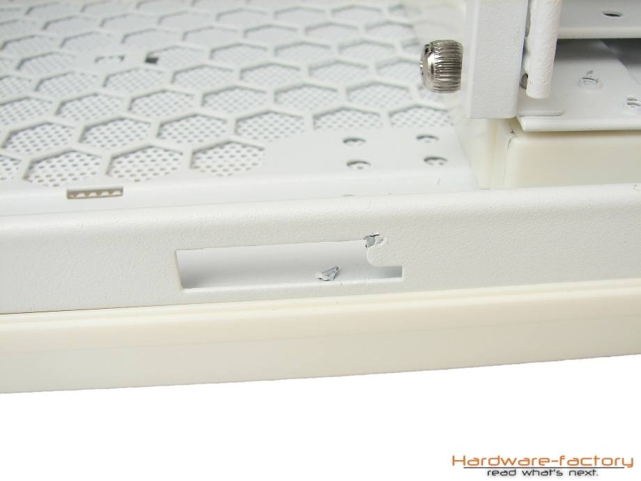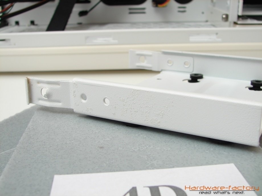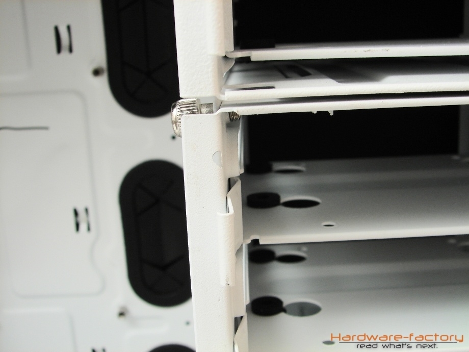 Zusammenfassend kann der Innenraum als sehr gelungen bezeichnet werden. Viele der Funktionalitäten wie die Öffnungen im Mainboardträger und der Einsatz von Platinen zum Anschluss von weiteren Gehäuselüftern haben sich in etwas abgewandelter Form bereits in der Vergangenheit als nützlich herausgestellt, der Einsatz von Staubfiltern im Bodenbereich kann für das Netzteil lebenswichtig sein und auch der flexible und variabel einsetzbare Festplattenkäfig hat seinen besonderen Vorteil. Scharfe Kanten oder Verarbeitungsmängel beim Material konnten zudem nicht festgestellt werden. Leider deckt sich der äußerst positive Gesamteindruck des Erstlingswerks nicht mit der Qualität der Innenlackierung. Diese ist leider stellenweise alles andere als sauber durchgeführt worden. An einigen Stellen im Gehäuse befinden sich Lacknasen, so zum Beispiel bei den Halterungen für die Seitenteile, die beim ersten Öffnen abbrechen. An anderen Stelle, vorzugsweise beim Festplattenkäfig und den Einschüben, hat der Lack vermehrt blasen geworfen, was auf eine eventuelle ungenügende Reinigung der Lackierfläche zurückgeführt werden kann. Nichtsdestotrotz sollte der Mangel in Relation gesehen werden. Da es sich bei diesem Modell um ein gedämmtes Gehäuse ohne Fensteröffnungen handelt, sind die Lackschäden zwar ärgerlich aber wenig dramatisch, zumal die Lakierfehler vermehrt an Stellen auftreten, die bei normaler Benutzung durch Hardware- und Gehäuseelemente verdeckt sind.