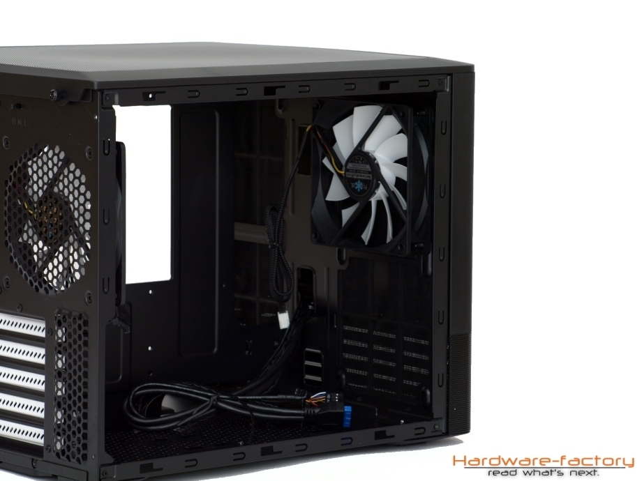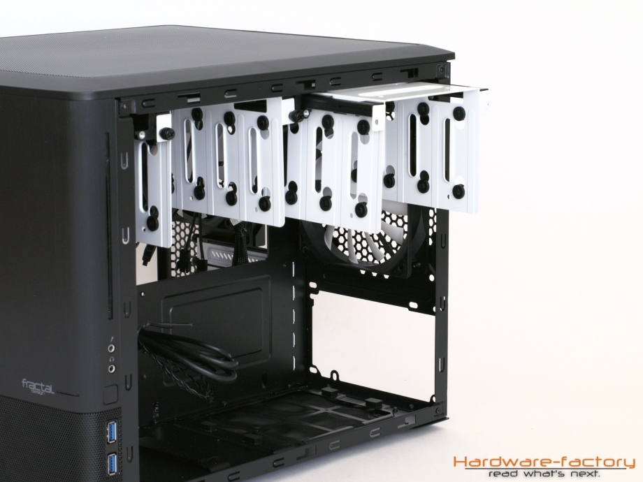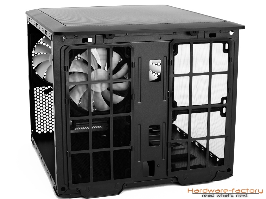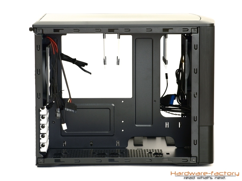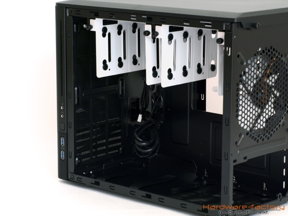 Die Gestaltung des Innenraums macht aufgrund des Zweikammer-Designs einen unkonventionellen Eindruck, da die Plätze für Festplatten zu fehlen scheinen, die Magnetspeicher jedoch aber hinter dem Mainboardträger untergebracht werden. Angenehm fällt die Öffnung an der Rückseite des Mainboards mit ihrer Größe auf, wodurch CPU-Kühler auch ohne Ausbau der Hauptplatine ausgetauscht werden können. Für die Verkabelung des µATX oder ITX Mainboards sind großzügige Durchführungen genauso vorhanden, wie Schlaufen für Kabelbinder. Die Verlegung von Wasserkühlungsschläuchen sollte ebenfalls leicht gelingen. Bei den PCI-Steckplätze werden genau so Rändelschrauben eingesetzt, wie bei den Gehäuseseitenteilen und dem Deckel. Hinter der Hauptplatine finden bis zu acht 3,5 Zoll Laufwerke Platz - vom Gehäuse durch Gummipuffer entkoppelt, selbstverständlich. Die weißen Halterahmen lassen sich für eine leichtere Montage entnehmen und einer kann sogar bei Bedarf an der Stelle der Klettbänder am Gehäuseboden angebracht werden. Dies kann dann hilfreich sein, wenn im Deckel ein Radiator oder ein Lüfter angebracht werden soll, wofür die Führungsschienen abgeschraubt werden können und müssen.