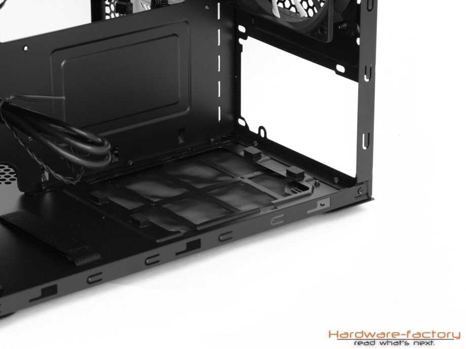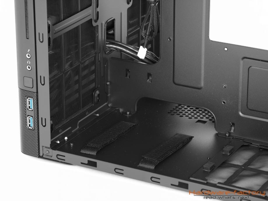 Das Netzteil, welches übrigens bis zu 260 mm tief sein darf, wird ebenfalls hinter dem Mainboard montiert und von vier Schaumstoffpuffern gestützt. Bei einem Modell mit fest angebrachten Kabelsträngen können die Klettbänder dafür genutzt werden, die nicht gebrauchten Kabel zu fixieren, damit diese nicht möglicherweise Lüfter blockieren. Die Lüfterplätze in der Front verfügen über Langlöcher, womit eine breitere Kompatibilität zu verschiedenen Wasserkühlungsradiatoren hergestellt wird - dies wäre auch für den oberen Gehäuseteil wünschenswert gewesen.