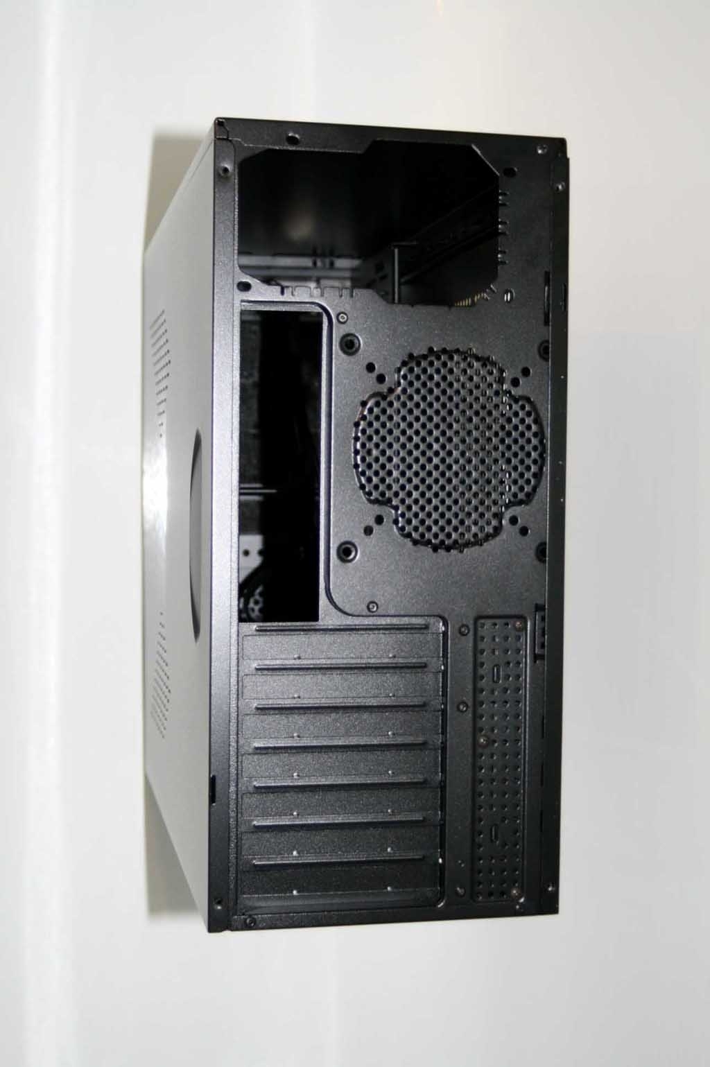 Einziehen soll als Unterlage ein DFI BI 785G M35 im µATX-Format, bestückt mit 2GB Micron DDR3-1066 CL7, die allerdings auf 1333 Mhz laufen sollen. Als Prozessor kommt ein stromsparender AMD Athlon II X2 245 mit 2,9 Ghz auf zwei Kernen zum Einsatz, der mehr als genug Leistung für ein HTPC-System bietet. Verbaut werden soll des Weiteren noch eine WLAN-Adapterkarte für den PCI-Bus, eine 80GB-SATA-HDD, für die HTPC-Anwendung an sich zu klein, aber für unseren Gehäusetest ausreichend, sowie ein SATA-DVD-Rom-Laufwerk von Philips. Für die Stromversorgung kommt ein beQuiet PurePower 430w-Netzteil zum Einsatz, als Unterstützung für den eingebauten Lüfter haben wir einen sehr leisen Scythe 800 UPM-Lüfter ausgewählt, der es uns in jedem Fall ermöglicht, sehr genau die Geräuschkulisse des mitgelieferten Lüfters zu analysieren. Eine lange Grafikkarte haben wir nicht zur Verfügung, wenn auf den Einbau einiger Festplattenlaufwerke verzichtet wird dürfte es mit der Montage jedoch bei knapp 29,5cm Platz keine Probleme geben. Höchstens mit ATIs aktuellen Flaggschiff - einer 5970 - könnte es Probleme geben, denn die Ausrichtung der Laufwerke ist nicht etwa im rechten Winkel zur Gehäuseachse konzipiert, was auch für einen Ein- und Ausbau der Laufwerke deutlich günstiger wäre. Trotzdem passt in unserem Fall aber alles, wie im Weiteren beschrieben: