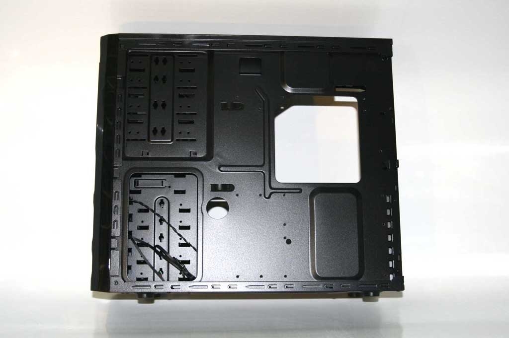 Das verwendete Stahlblech wirkt beim ersten Eindruck verglichen mit Gehäusen der oberen Preisklasse doch verhältnismäßig dünn, verhält sich jedoch beim Handling letztlich erstaunlich stabil und formhaltig. Ein bischen aufpassen muss man mit der Mesh-Front, insbesondere mit den Laufwerksblenden, die bei der hier teilweise notwendigen Gewaltanwendung doch etwas Verformungsenergie aufnehmen können. Letztlich schadet dies jedoch nicht, der Schaden kann behoben werden und man merkt es dem Teil auch nicht weiter an. So muss man Mesh-Fronten also nehmen wie sie sind, luftig und etwas fragil, was ja durchaus verzeihlich ist, solange keine bleibenden Schäden entstehen.