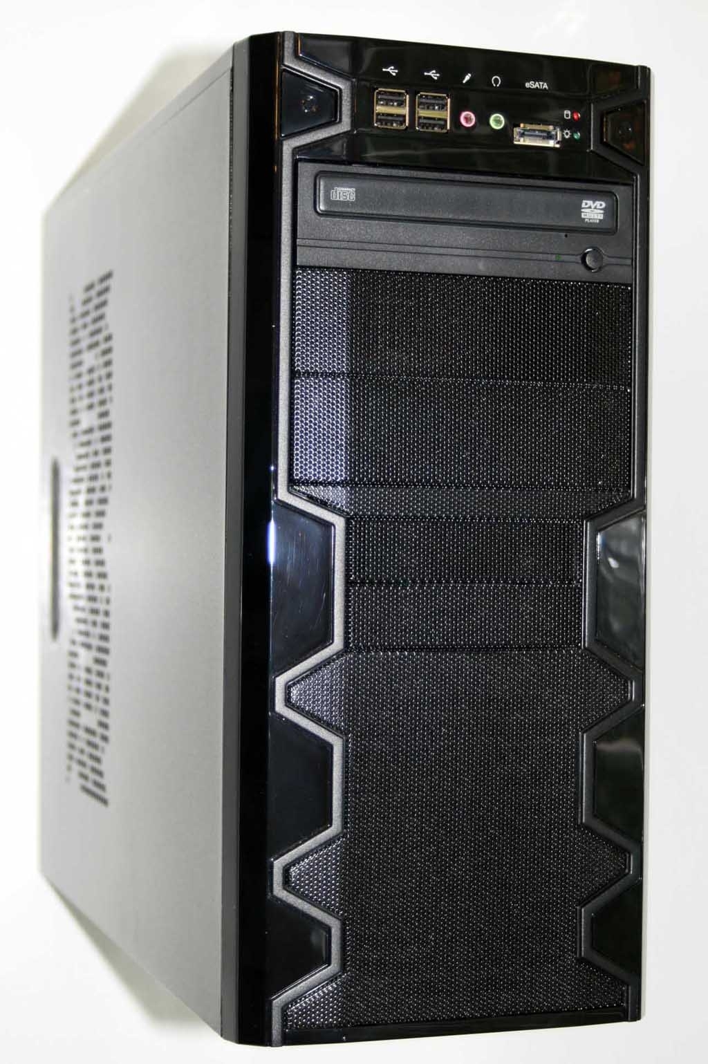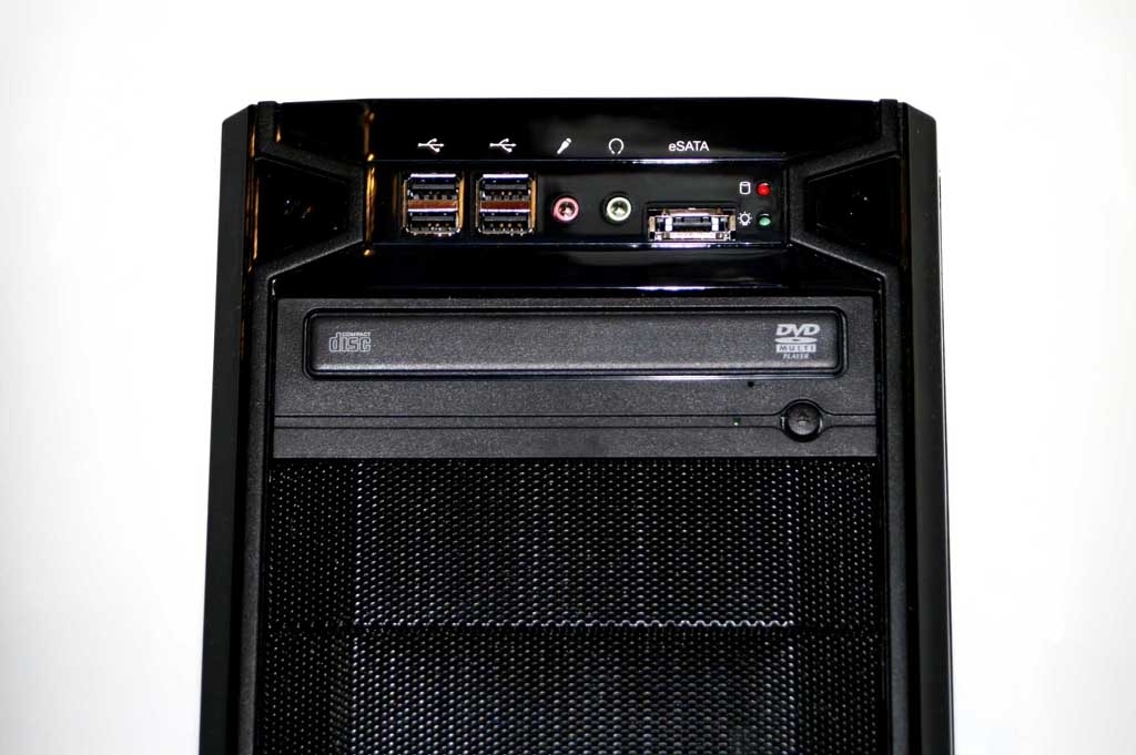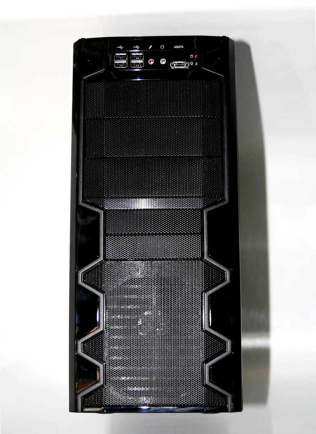 Auch die weitere Ausstattung kann sich sehen lassen:  Gut erreichbar am oberen Ende der Mesh-Front ist das Frontpanel platziert, das so ziemlich alles bietet, was benötigt wird und sogar noch etwas mehr: Ganze vier USB-Ports konkurrieren mit einem eSata-Port um den Anschluss datenspeichernder und datenübertragender Zusatzgeräte. Mikrofon- und Kopfhöreranschluss sind natürlich ebenso vorhanden und je eine LED für Power und HDD informieren über den Betriebszustand des Systems. Es gibt weiterhin einen eingebauten Lautsprecher zur Ausgabe der Lebenszeichen des Systems – bei neueren Gehäusen gar nicht mehr allzu selbstverständlich und als umso praktischer zu bewerten, je öfter man bereits ein System ohne beruhigende oder beunruhigende Piepser betrieben hat.