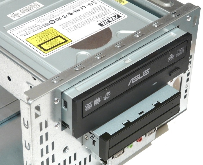 Es können unter anderem folgende Laufwerke verbaut werden. So befindet sich im ersten Schacht des Gehäuses ein 5.25“ Laufwerk. Hier kann entschieden werden, ob Blue Ray Laufwerk, DVD-Brenner oder eine Lüfter-Steuerung dort seinen Platz finden darf. Unter dem 5,25" Laufwerksschacht befindet sich ein 3.5" Diskettenlaufwerkschacht. Hier können alle 3.5“ Zoll Geräte ihren Platz einnehmen.