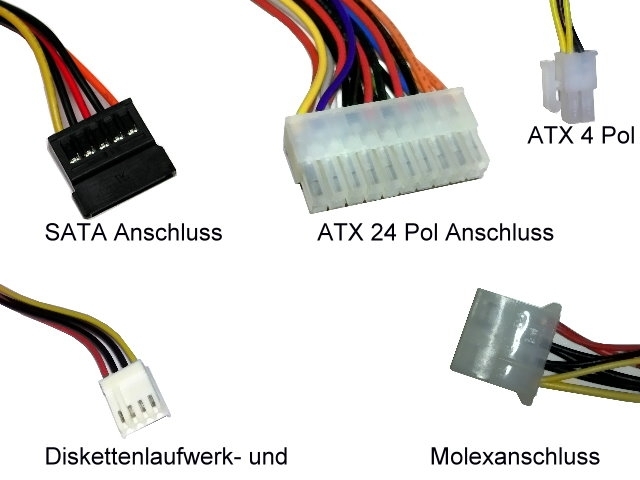 Kabel: 1x 20+4pin, 1x SATA mit 2 Anschlüssen, 1x 12V4PIN Kabel, 1x IDE mit 2 Anschlüssen, 1x 2IDE Foppy/4Pin.