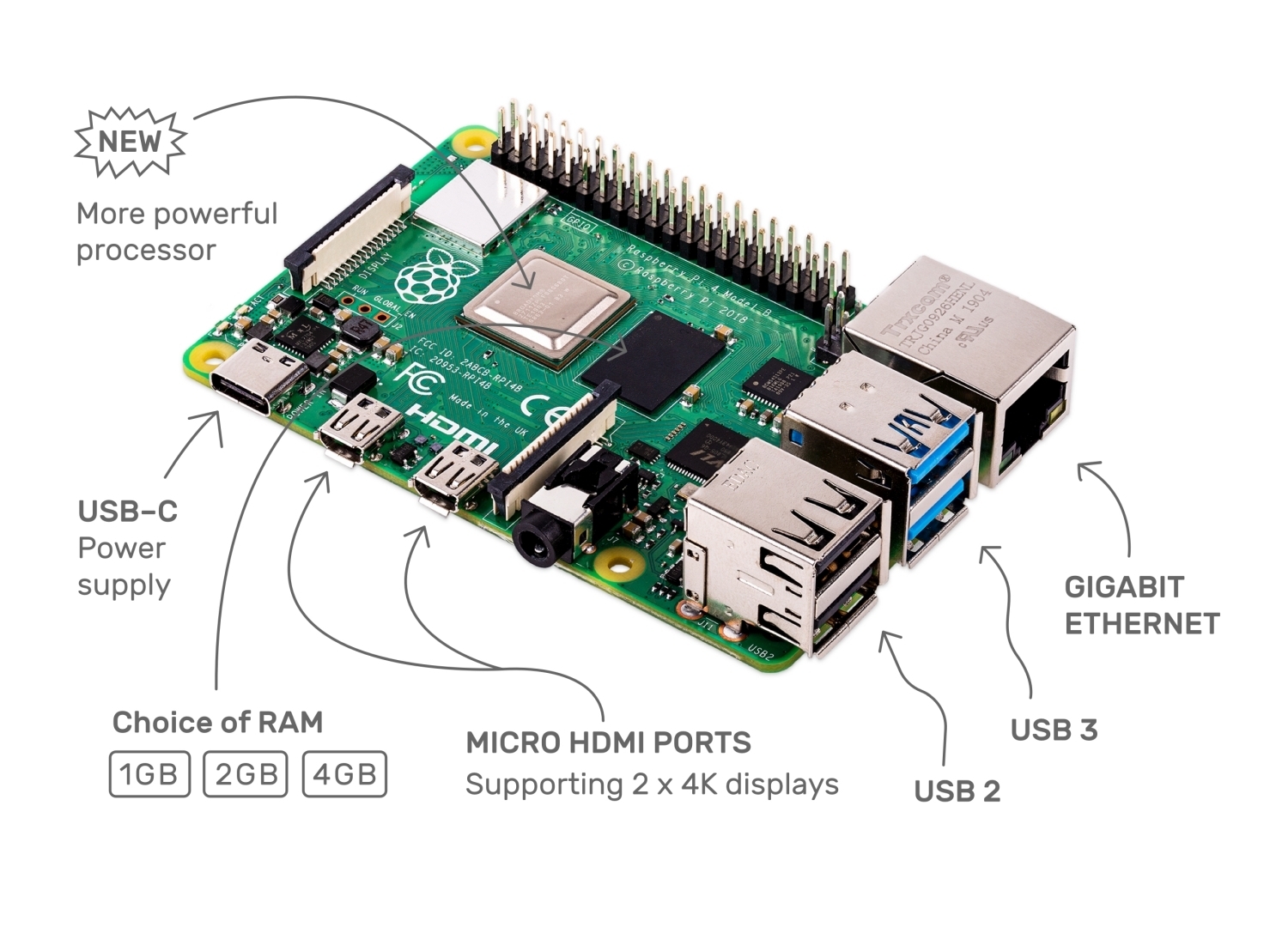 Raspberry Pi stellt heute das neue Modell Raspberry Pi 4 vor, ein deutlich schnellerer Mini-PC, der zwei 4K-Monitore antreiben kann. Dieser vollständige Desktop-PC ist in den Varianten 1GB, 2GB, und 4GB ab 31€ erhältlich und ist somit der weltweit erschwinglichste Multimedia-PC. Die vierte Generation des Raspberry Pi stellt für den meistverkauften britischen Computer einen Meilenstein in Geschwindigkeit und Leistung auf. Das Gerät kommt mit einer dreifachen Prozessor- und vierfachen Multimedia-Leistung gegenüber seinem Vorgänger, dem Raspberry Pi 3B+. Zum ersten Mal repliziert es den vollständigen Funktionsumfang eines traditionellen Computers - vom superschnellem File-Sharing bis hin zum Multi-Tab-Surfen sowie fortschrittlichen Video- und Foto-Bearbeitung - alles in einem winzigen, umweltfreundlichen, ethisch hergestellten Bundle.
