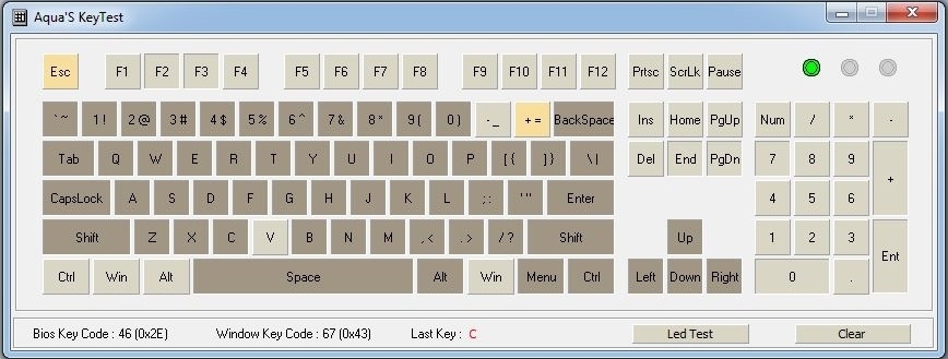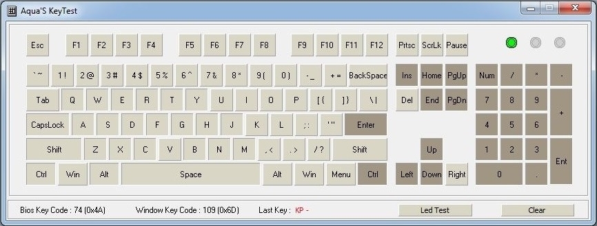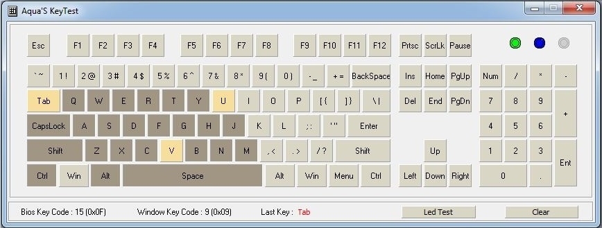 Die einstellbaren Werte der Abtastrate lassen bereits vermuten, was unsere Analyse der USB-Konfiguration der Tastatur belegt. Im vorliegenden Fall wird von der Tastatur USB2.0 im Full-Speed-Modus verwendet, wodurch NKRO bestmöglich unterstützt wird. Eine NKRO-Fähigkeit wurde im Anschluss mit dem Programm "Aqua Key Test" überprüft. Die nachfolgenden Abbildungen zeigen deutlich, dass nicht nur der WASD-Bereich, sondern auch alle von uns gedrückten Tasten sauber erkannt werden.