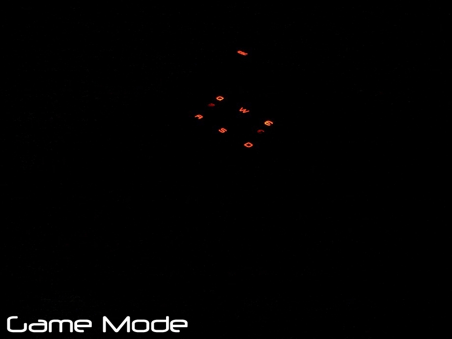 Aufgrund der recht dünnen Schriftart kommt der zweifarbigen Beleuchtung neben dem optischen Akzent auch eine praktische Bedeutung zu. Denn gerade bei schwierigen Lichtverhältnissen können die ausgesparten Buchstaben schwerlich bis gar nicht mehr gelesen werden, sodass ein Zuschalten der Beleuchtung vonnöten ist. In der kleinsten Helligkeitsstufe (30%) entspricht die Leuchtkraft der weißen LEDs in etwa einem weißem Aufdruck. Die Einstellungsmöglichkeiten der Beleuchtung lassen jedoch noch viel Raum für Verbesserungen. Zwar existieren sechs verschiedene Beleuchtungsprofile, allerdings zählen zu diesen auch ein Pulsieren, welches in der Praxis wohl kaum Anwendung findet, und der ausgeschaltete Zustand (0 % Helligkeit). Somit verbleiben folglich noch vier Modi: der Gaming Mode (nur rote LED-Beleuchtung aktiv) sowie drei Helligkeitsstufen (30 %, 70%, 100 %), welche sich primär auf die weißen LEDs auswirken.