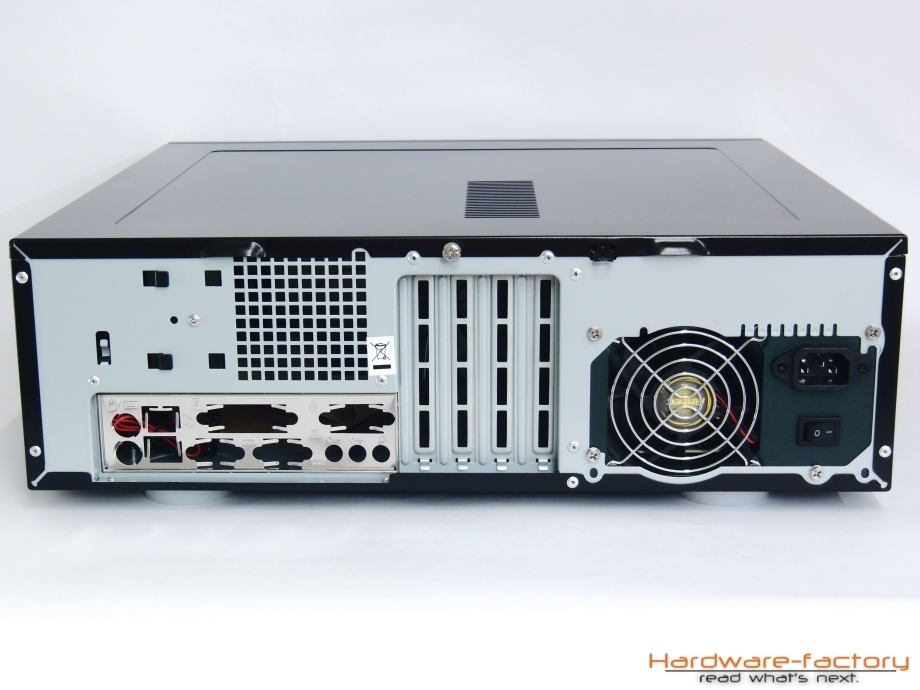 Auf der Rückseite hat Antec ebenfalls kein Neuland betreten und bleibt bei Bewährtem. Von links nach rechts betrachtet sieht man die Anschlussblende, 4 Steckplätze für Erweiterungskarten und das Netzteil. Das Lochgitter über der Anschlussblende sieht keine Montage eines Lüfters vor. Als einzige Ausnahme bleibt hier die Möglichkeit das Gehäuse mit einem Schloss oberhalb des Netzteils zu sichern, was nicht jedes Gehäuse bietet.