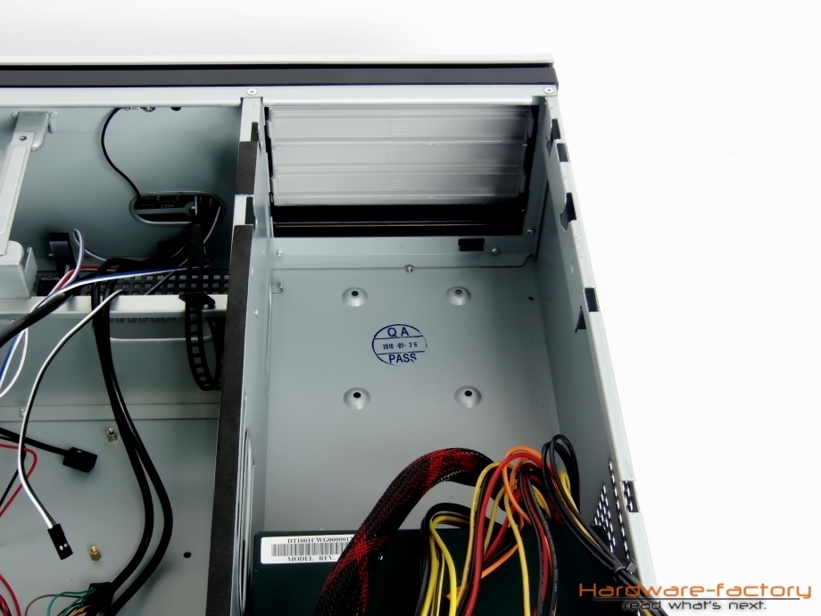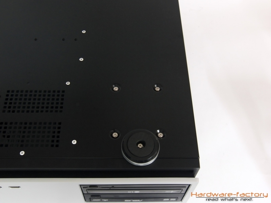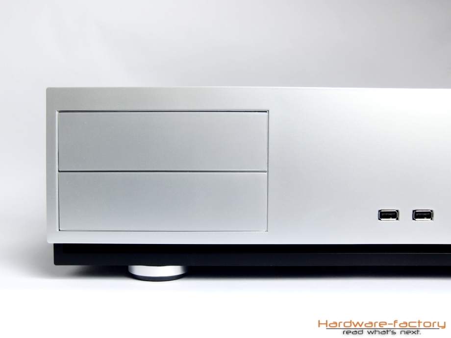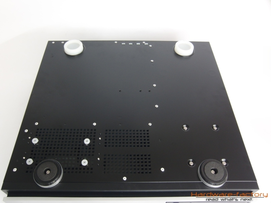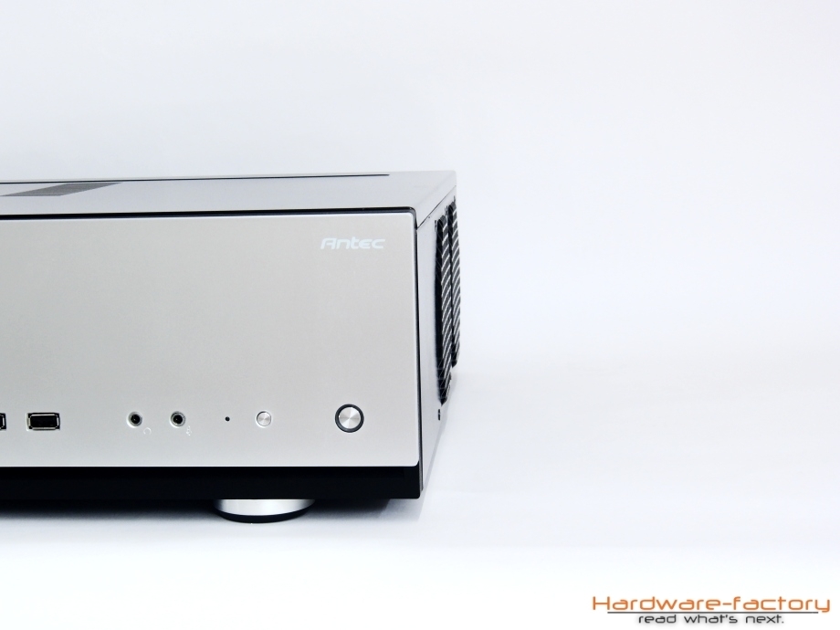Das Antec NSK2480 steht sicher auf vier Füßen, von denen sich die zwei vorderen im edel wirkenden silbernen Design in eine Hifi-Umgebung gut einfügen würden. Die hinteren Füße sind aus relativ hartem weißen Gummi und dienen wie die vorderen der Entkopplung des Gehäuses von seiner Unterlage. Im Lochgitter sieht man vier weiße Silikonpuffer, die der Entkopplung der intern verbaubaren 3,5 Zoll Laufwerke dienen. Auf deren Effekt gehen wir im Kapitel Lautstärketest ein. Unter den 5,25 Zoll Laufwerken befindet sich der Platz für die 2,5 Zoll Festplatte. Hier liegen dem Gehäuse vier Schrauben bei, die nur für die Verwendung an diesem Platz gedacht sind. Gummipuffer sind für diesen Platz allerdings nicht vorgesehen.