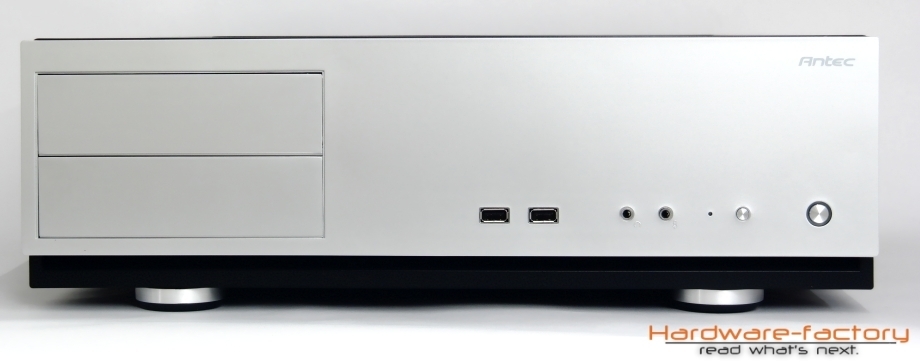 Das Antec NSK2480 aus der NewSolutions Reihe orientiert sich an einem schlichten, funktionalen aber dennoch edlen Design. Dabei geht Antec keine Experimente ein, was man auch den anderen Gehäusen der NewSolutions-Reihe ansehen kann. Ein Erfolg in Unternehmen, die den Löwenanteil des Computer-Hardware-Marktes ausmachen, rückt damit in greifbare Nähe, zumal die Preisgestaltung von ca. 90€ inklusive Netzteil keinesfalls abgehoben erscheint. So ist es auch nicht verwunderlich, dass zwei Materialien bei diesem Gehäuse allgegenwärtig sind: Stahl und Plastik. Der Stahl macht dieses Gehäuse besonders stabil, aber auch schwer und das Plastik ermöglicht ein edles Aussehen bei hoher Flexibilität und geringen Fertigungskosten. Dabei ist die Front mitsamt der Abdeckungen für die 5,25 Zoll Einschübe aus silbernem Plastik gefertigt und trägt einen ebenfalls silbernen Firmenschriftzug. Lediglich Kopfhörer- und Mikrofonanschluss sind durch Erhebungen gekennzeichnet, ansonsten besticht die Front durch schlichte Eleganz.