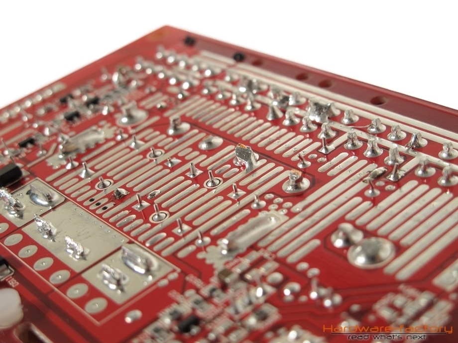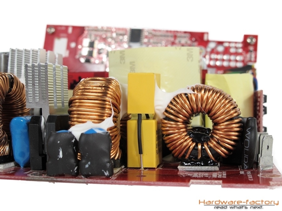 Der Innenraum der V-Serie von Cooler Master bietet zunächst einmal jene hochwertige Verarbeitung, die in dieser Preisklasse erwartet wird: Alle verbauten Komponenten finden auf einem in diesem Fall roten Epoxidharz-Glasfaserplatten-PCB sowie kleineren Zusatz-PCBs Platz, ein Blick auf die Rückseite der Hauptplatine zeugt von einer sehr guten Lötqualität: Die ohnehin kaum vorhandenen Überstände, die bei der Verarbeitung auftraten, wurden ordentlich abgeschnitten, so dass das V1000 auch unter seinem Gewand eine sehr gutes Erscheinungsbild abliefert.