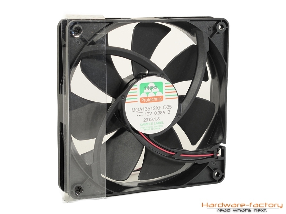 Der verwendete 135 mm Protechnic MGA13512XF-O25 Lüfter ist vom Hersteller mit einer Maximaldrehzahl von bis zu 1800 U/min spezifiziert - die allerdings im Praxiseinsatz an der Teststation, die wir ansonsten auch für Prozessorkühler- oder Gehäusetests nutzen, hörbar nicht einmal näherungsweise von uns erreicht wurden. Der Lüfter verfügt über eine Steckverbindung und kann somit im Fall eines Defekts schnell ersetzt werden.