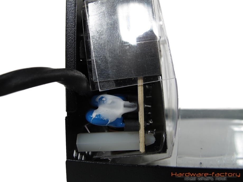 Vorbildlich umgesetzt wurde die Anbindung der modularen Kabelanschlüsse beziehungsweise der für diese zur Verfügung stehenden Zusatzplatine - nur sehr wenige, ummantelte Kabel sollten den durch den Lüfter erzeugten Luftstrom kaum in irgendeiner Weise behindern (vgl. dazu die Bilder im Abschnitt zum sekundären Schaltkreis).