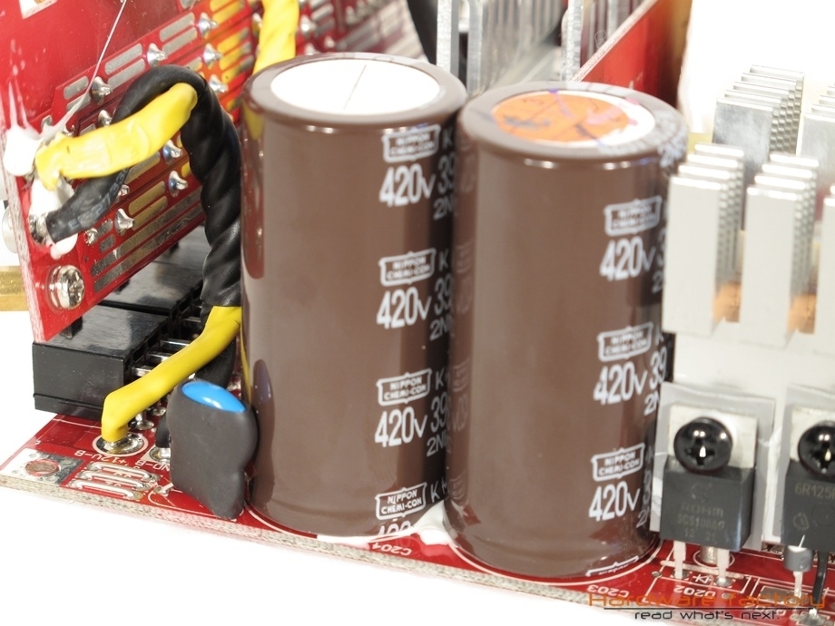 Primärseitig kann das Cooler Master V1000 auf zwei große, parallel geschaltete Nippon Chemicon Kondensatoren zurückgreifen. Diese verfügen über eine Spannungsfestigkeit bis 420 V und eine Kapazität von jeweils 390 Mikrofarad (zusammen 780 Mikrofarad) bei einer Temperaturfestigkeit von bis zu 105 °C.