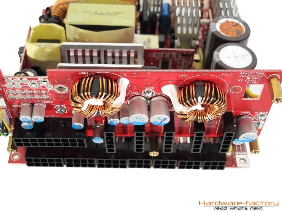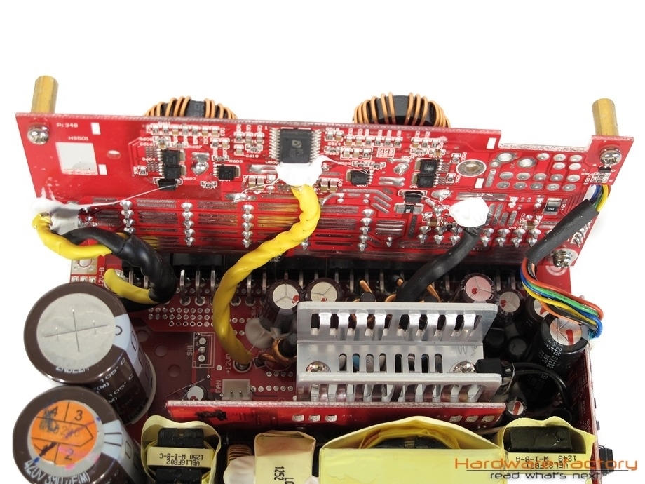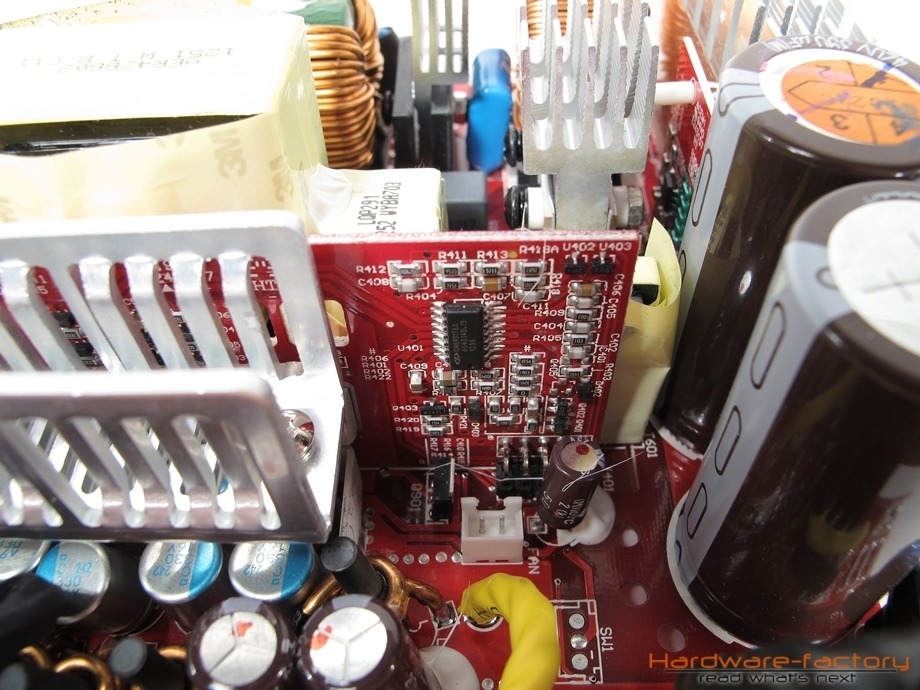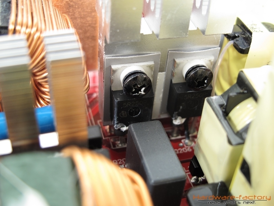 Das V1000 setzt auf Full Bridge Topologie - hier erzeugen vier Mosfets (Infineon IPP50R250CP, gekennzeichnet als "5R250P") die hochfrequenten Wechselspannungen, mit denen das Netzteil arbeitet. Zur weiteren Effizienzsteigerung wurde mit dem Champion CM6901 ein Chip zur LLC-Resonanzwandlung verwendet (vgl. den 16poligen Chip auf dem senkrecht angebrachten Zusatz-PCB).
