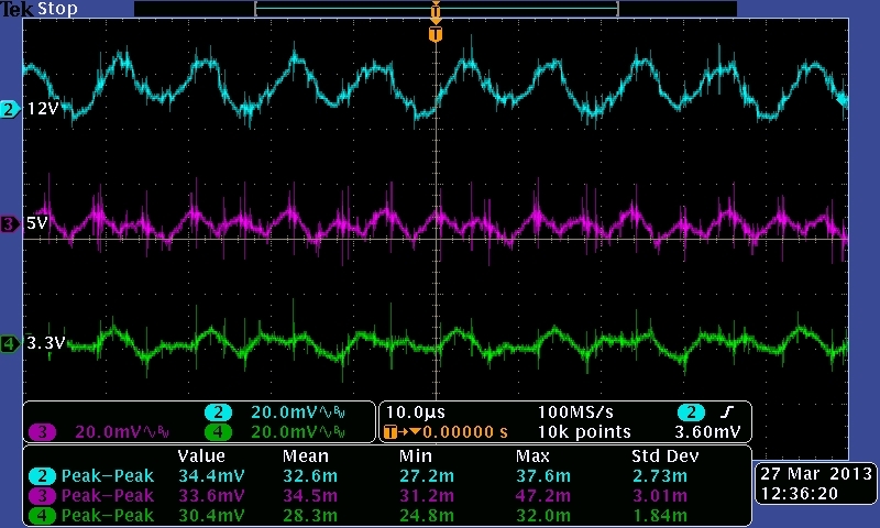 Wie unsere Messungen mit dem digitalen Speicheroszilloskop bei 100%iger Auslastung des Netzteils zeigen, befindet sich das Cooler Master V1000 nicht nur innerhalb der vorgegebenen Werte, sondern liefert darüber mit 32,6 mVpp bei 12V sogar einen Rekordwert im Vergleich zu den meisten anderen Netzteilen selbst in dieser Preisklasse.
