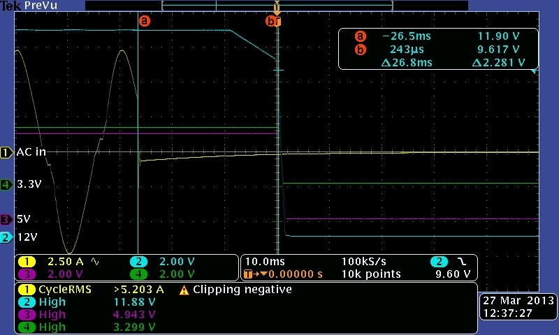 Das Cooler Master V1000 schafft es 26,8 Millisekunden lang, die 12 V Versorgung ohne Stromzufuhr von außen weiter zu gewährleisten - das ist erneut ein sehr guter Wert, war aber angesichts der Bauteilbestückung genau so zu erwarten.