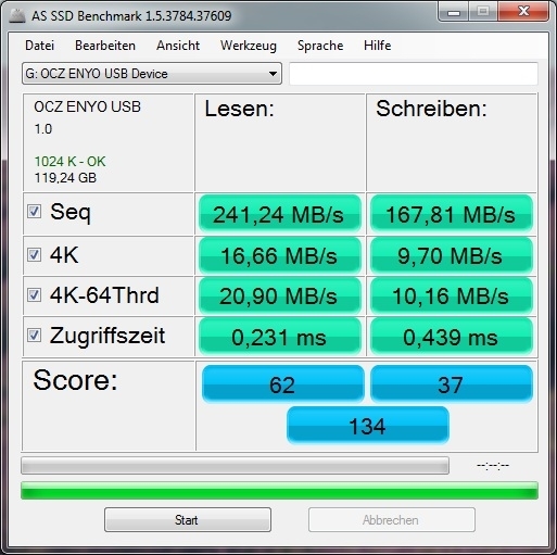 Selbst mit der Transcent-Adapterkarte funktionierte die Enyo mit und ohne Treiber bei uns problemlos. Nur bei besonderen Benchmarkaufgaben kam es zu Ausfällen, die jedoch eher auf Seiten des USB-Adapterkartentreibers zu suchen sind. In der Praxis würde die Enyo also auch an einem nicht ganz optimalen USB 3.0-Anschluss mit guter Geschwindigkeit funktionieren. Zudem muss man sagen, dass die Anzahl Operationen, die die Enyo in diversen Benchmarkszenarios zu verarbeiten in der Lage ist, für die USB-Schnittstelle sicher verhältnismäßig unerwartet kommen und die Treiber für die USB-Chipsätze in dieser Richtung sicher noch ein wenig verbessert werden können. Schließlich handelt es sich um einen noch sehr jungen Standard. Wir waren erstaunt, was über einen USB-Anschluss möglich ist. Das korrekte Alignment überprüften wir mit AS-SSD. Die in grün gehaltene Angabe der Blocksize von 1024 mit der dahinter stehenden OK-Angabe bestätigt uns, dass alles in Ordnung ist.