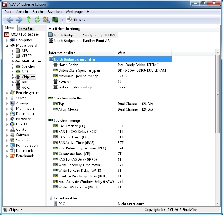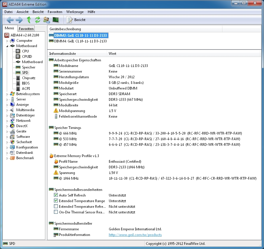 In den ersten Screenshots von CPU-Z und AIDA64 zeigt sich zwar ein sauberes, aber nicht so umfangreich programmiertes SPD (Serial Presence Detect), wie wir es vor kurzem in unserem Test des Kingmax Speicherkits vorfinden konnten. GeIL hinterlegt hier Latenzeinstellungen für Taktraten bis 666 Mhz, was einem DDR3-1333 Betrieb entspricht und stellt zusätzlich ein XMP-Profil im EEPROM des Speicherkits bereit, welches nach Aktivierung die maximale Taktgeschwidigkeit und die dazugehörigen Latenzen einstellt. Diese Einstellungen wurden von dem in diesem Test verwendeten ASRock Extreme4 Mainboard einwandfrei erkannt und eingestellt, was in den beiden letzten Screenshots von CPU-Z und AIDA64 ersichtlich ist. Ein wenig verwunderlich ist, dass in der "Auto"-Einstellung auch Werte über 255 für tRFC möglich zu sein scheinen, während die manuelle Eingabe keine höheren Werte als die magische Grenze von 255 zulassen. Da das Speicherkit für eine Betriebsspannung von 1,5 V spezifiziert ist, geht der Hersteller kein Risiko ein und setzt diese Spannung für sämtliche Taktraten ein. Wir nutzen im Test die Grundwerte des XMP-Profils und verringern diese schrittweise, um noch etwas mehr Leistung aus den Chips holen zu können. Die Ergebnisse können von Speicherkit zu Speicherkit unterschiedlich ausfallen und sind auch abhängig von der Güte des Speichercontrollers und somit auch von der Testplattform. Das Ergebnis dieser Untersuchung lautet: