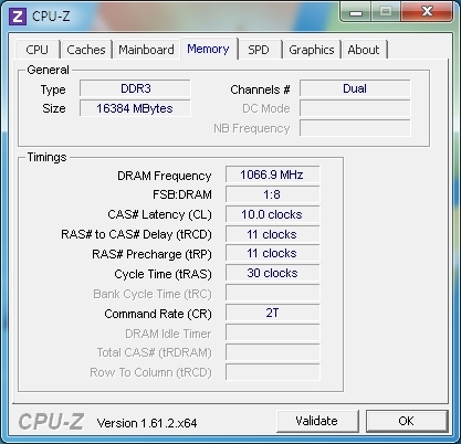 Unser Testexemplar lies bei 933 MHz Arbeitsfrequenz Speichertimings von 9-9-9-30 zu, bei gleichbleibender Command Rate von 1T und einer Betriebsspannung von 1,5 V. Bei den Subtimings vertrauten wir hier auf die Werte, die im XMP-Profil für einen Takt von 1066 MHz vorgesehen sind. Nach Erhöhung der Spannung auf 1,65 V konnten wir noch CL 8-9-9-25 Timings herauskitzeln, was nur kaum ein besseres Ergebnis darstellt. Es zeigt sich bereits die Tendenz, dass die verwendeten Speicherchips kaum mit mehr Spannung skalieren.