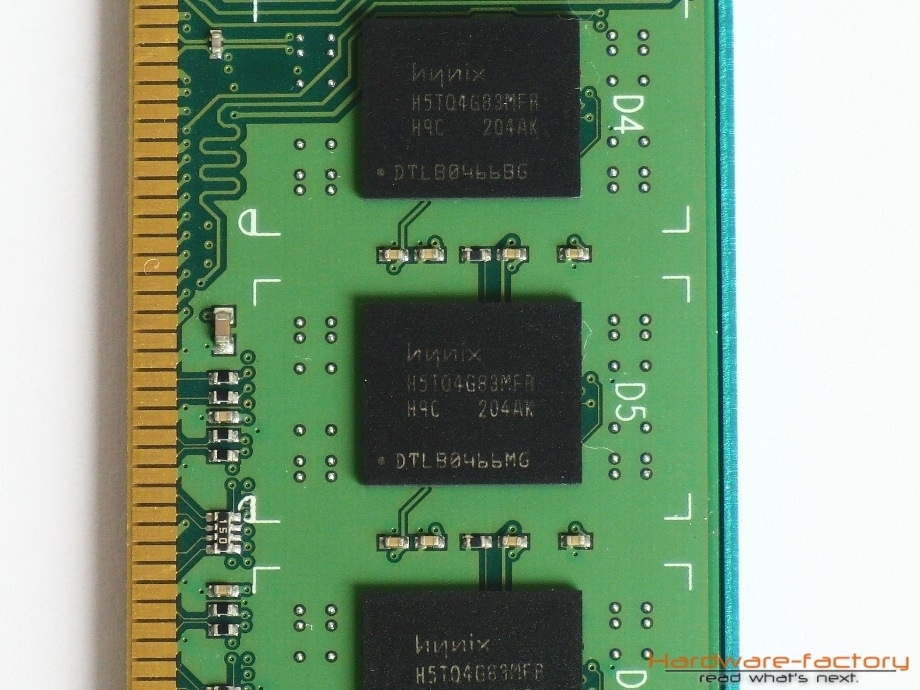Der türkisfarbene Passivkühler selbst ist nur 26 mm hoch, wodurch der Speicher eine Gesamthöhe von lediglich 31 Millimetern besitzt. Mit dieser geringen Höhe ragt der Speicher nur kaum über die Speichersteckplätze hinaus und ermöglicht die komfortable Installation auch unter einem Tower-Kühler, wie wir ihn hier im Test zur Kühlung der CPU verwenden. Die Verarbeitung ist hervorragend und jeder Chip ist sichtbar mit dem Kühlkörper verklebt. Um dies sicherzustellen, verwendet GeIL ein sehr breites selbstklebendes Wärmeleitpad, wie auf dem Bild zu sehen ist. Unter diesem verbergen sich Chips von Hynix mit der Modellbezeichnung H5TQ4G83MFR und der Geschwindigkeitsmarke H9, für die eine Versorgungsspannung von 1,5 Volt bei bis zu 1866 MHz vorgesehen ist. Interessierte Leser finden hier technische Dokumente, die seitens Hynix zu diesen Chips zur Verfügung gestellt werden.