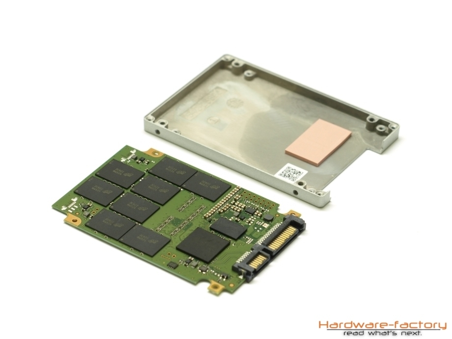 Im Inneren befindet sich eine Platine, die neben den Flashbausteinen den Controller und schnellen Zwischenspeicher für denselbigen miteinander verbindet. Mit Hilfe eines Wärmeleitpads wird die Abwärme des SSD-Prozessors an das Gehäuse aus Aluminium weitergeleitet. Die vollständige Bestückung der Platine verrät uns, dass hier 16 Bausteine mit einer Kapazität von jeweils etwa 30 GB eingesetzt werden, womit deutlich wird, welchen Fortschritt die Flash-Hersteller in den letzten Jahren gemacht haben, indem sie die Packdichte durch kleinere Strukturbreiten weiter erhöhen konnten. Wir können in Zukunft mit noch größeren Kapazitäten und fallenden Preisen rechnen, sodass überall dort, wo Geschwindigkeit und geringe Geräuschemissionen eine Rolle spielen, die SSD ihren Siegeszug fortsetzen und die HDD mehr und mehr ablösen wird.