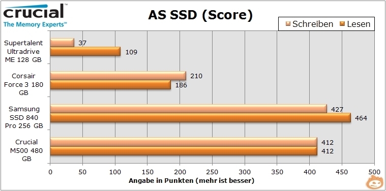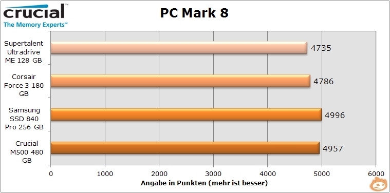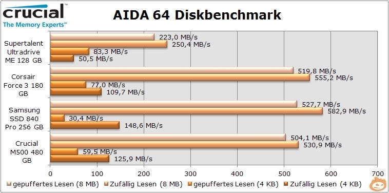 In Futuremarks PC Mark 8 liegt das Feld der getesteten SSDs sehr dicht beieinander. Crucials M500 liegt hier nahezu gleich auf mit Samsungs SSD 840 Pro. Etwas abgeschlagen sind die älteren Kontrahenten, wobei die über zwei Jahre alte Supertalent Ultradrive SSD sich erstaunlich gut schlägt. Der synthetische Diskbenchmark von AIDA64 zeigt die Unterschiede zwischen Laufwerken deutlicher auf. Hier schlägt das Supertalent Laufwerk von 2011 alle Kontrahenten in der Disziplin "gepuffertes Lesen von 4 KB großen Dateien". In den anderen Kategorien geht die Siegermedaille knapp an Crucials M500 vorbei.