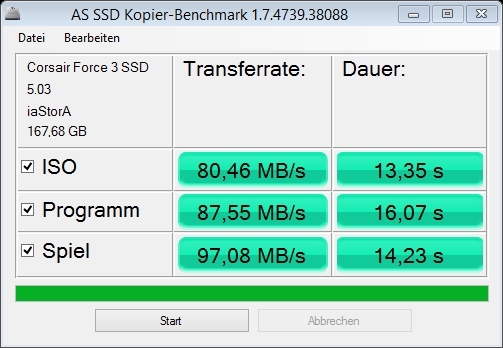 Wenn die Grenzwerte einer SSD herausgefunden werden sollen, dann eignet sich der ATTO Disk Benchmark sehr gut. Oft beruhen auch Herstellerangaben auf den Ergebnissen dieses Benchmarks. Es werden vollautomatisch Dateien mit Größen von 0,5 KB bis hin zu 8 MB gelesen und geschrieben und dabei die Datenrate in KB/s gemessen. Während Crucials M500 bei der Leseperformance doch einiges an Federn lassen und sich sogar bei kleinen Dateigrößen der Corsair Force 3 geschlagen geben muss, so liegen doch fast alle Kontrahenten gleich auf, wenn es um die Schreibperformance geht. Lediglich die etwas betagte Supertalent SSD hat hier deutlich das Nachsehen und bringt es meist nicht einmal auf die Hälfte der Geschwindigkeit der anderen Laufwerke. Warum diese Zahlen nur wenig mit der Realität zu tun haben, klären wir im Folgenden.