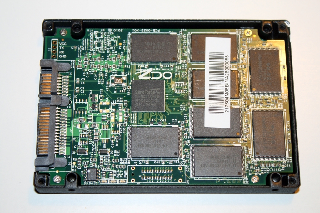 Uns interessiert bei einem solchen Produkt natürlich nicht nur das Äußere, sondern vielmehr geht es natürlich um die inneren Qualitäten. Wir konnten es uns daher nicht verkneifen, das Garantiesiegel zu zerstören und das Innere der OCZ freizulegen. Zum Vorschein kommt die Platine mit dem SandForce SF 1200 Controller und den Flash-Speicherchips von Intel. Das Innenleben ist aufgrund der Kapazität unseres 60GB-Testkandidaten übersichtlich. Für die gebotene Kapazität werden 8 Flashbausteine eingesetzt. Neben dem SATA-Daten und Stromanschluss gibt es keine weiteren Anschlüsse. Ein extra Cache-Baustein ist zunächst nicht erkennbar, mehr hierzu beim Blick auf die Spezifikationen auf der nächsten Seite. Ein Mini-USB-Anschluss wie bei einigen anderen SSD's ist ebenfalls auch unter der Haube nicht vorhanden, obwohl sich die erforderlichen Lötstellen auf der Platine befinden. Wir sind jedoch der Meinung, dass ein USB-Anschluss für die Leistung der SSD unangemessen wäre. Als mobilen Datenspeicher sollte man zu günstigeren und weniger leistungsstarken Modellen greifen. Diese SSD muss über eine schnelle Schnittstelle angebunden werden, für die sich USB nicht qualifiziert. Wir stehen hier bei der Produktkonzeption ganz hinter OCZ, dass die SSD als Systemplatte für den Festeinbau ohne zusätzliche USB-Schnittstelle konzipiert ist.